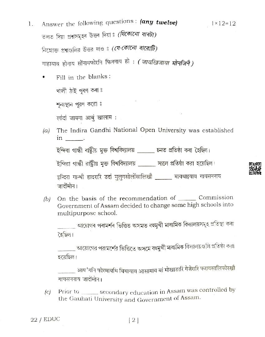 The Assam Board Previous Year Question Paper for HS 2nd Year (Class 12) Education is as follows.
