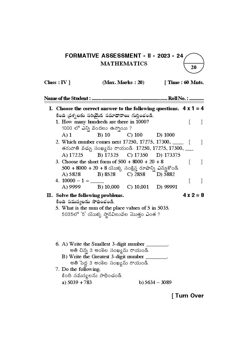 AP 4th Class FA2 Maths Question Paper 2024
