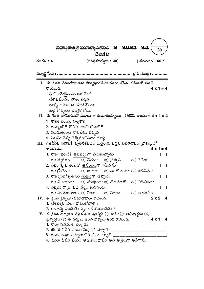 The AP Board Question Paper of Class 4th for FA2 Exams of Telugu subject is as follows.