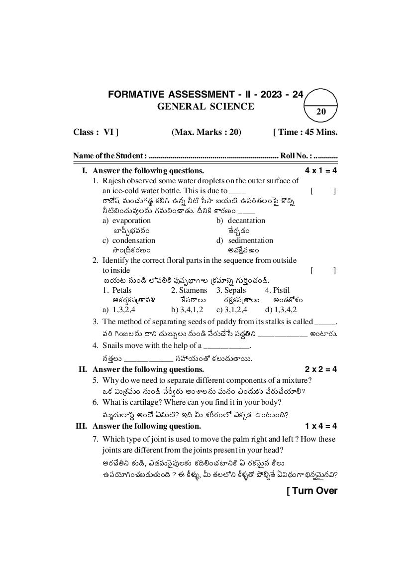 AP Class 6 FA2 Question Paper 2023 Science View Download