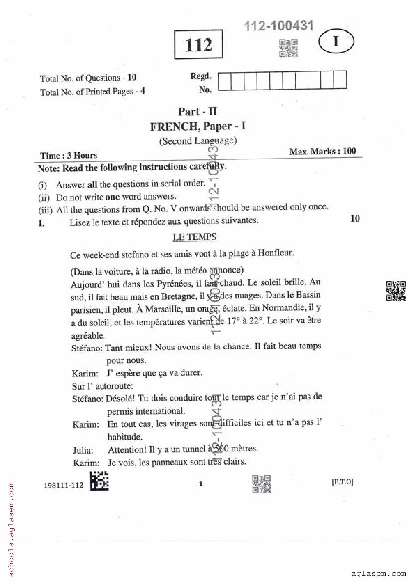 AP Inter 1st Year French Question Paper is published by BIEAP. You can hence download the Inter 1st Year French question paper PDF from this page on Aglasem. This pdf of AP Intermediate 1st Year Question Paper contains all questions asked in French in previous year. Thus if you solve this AP Intermediate question paper, then you will know what to expect in your Class 11 / 11th French exam and get full marks in AP board exams.