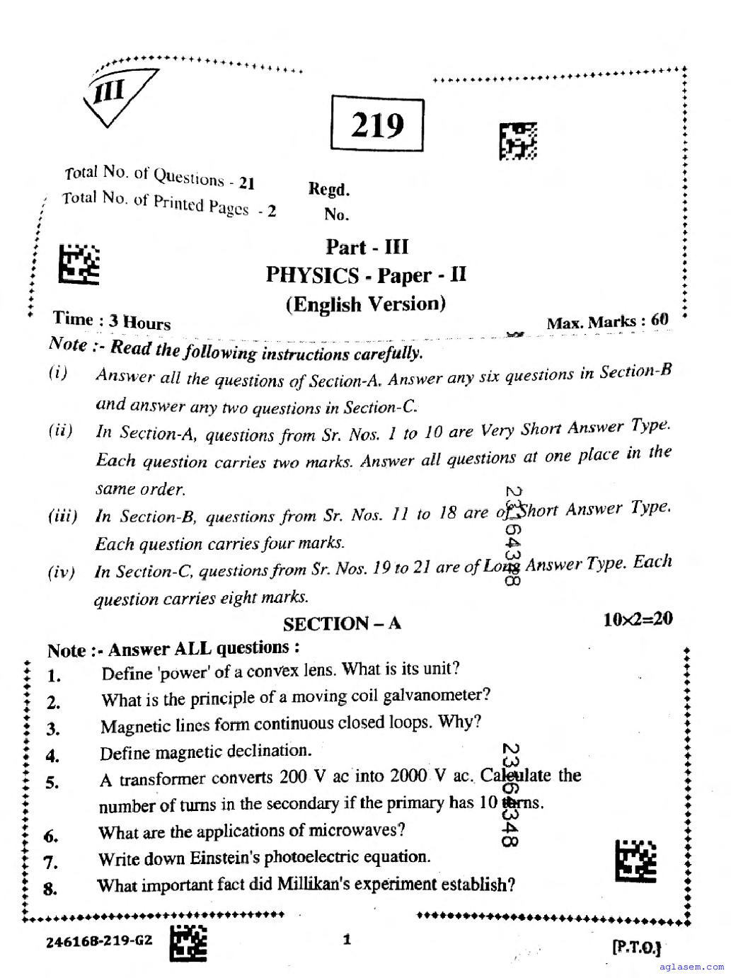 AP Inter 2nd Year Physics Question Paper is published by BIEAP. You can hence download the Inter 2nd Year Physics question paper PDF from this page on Aglasem. This pdf of AP Intermediate 2nd Year Question Paper contains all questions asked in Physics in previous year. Thus if you solve this AP Intermediate question paper, then you will know what to expect in your Class 12 / 12th Physics exam and get full marks in AP board exams.