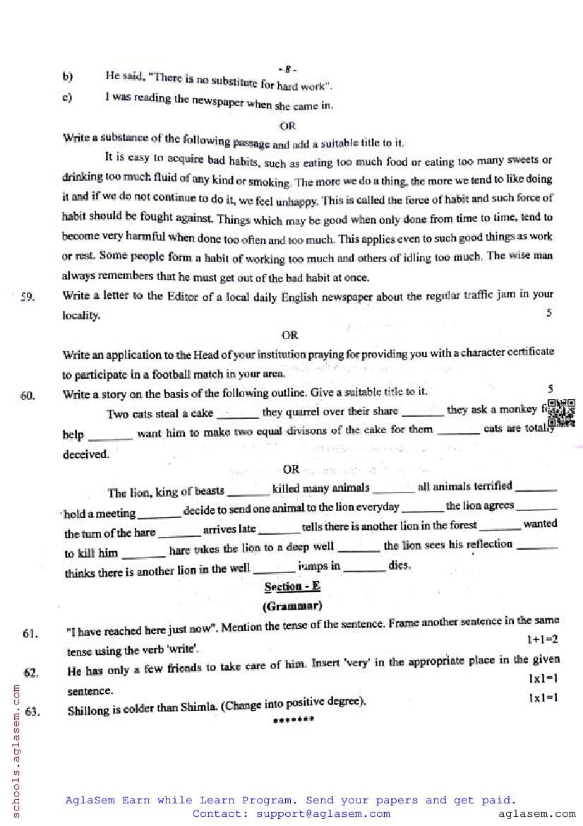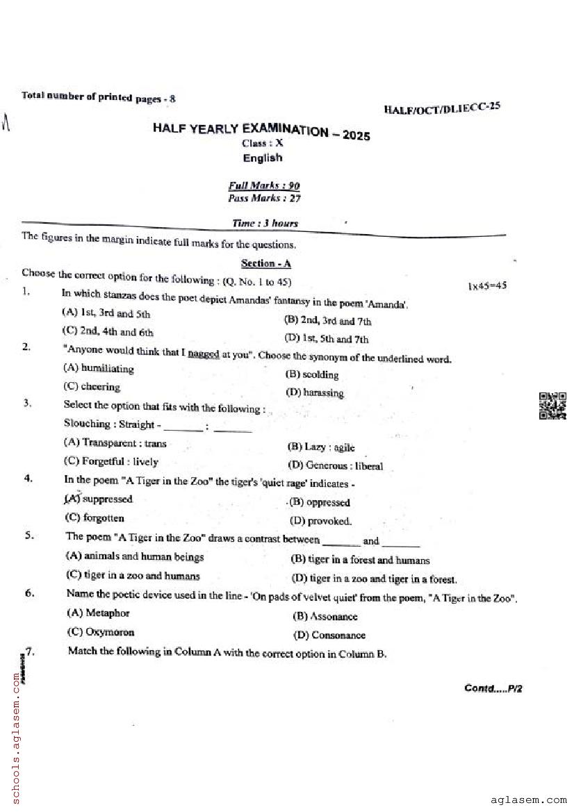 The half yearly question paper for assam board class 10 (or HSLC std) for English subject is as follows.