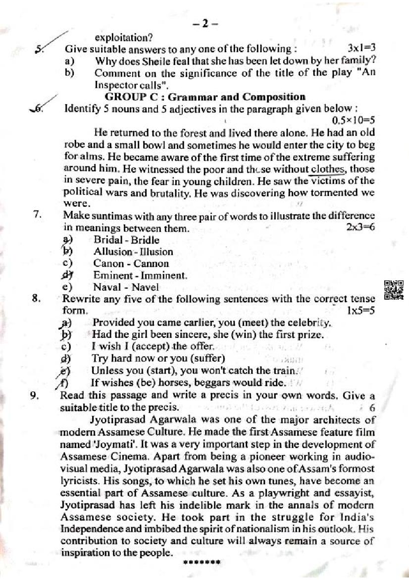 | Paper Here | Assam HS 1st Year Half Yearly Question Paper English Alternative |