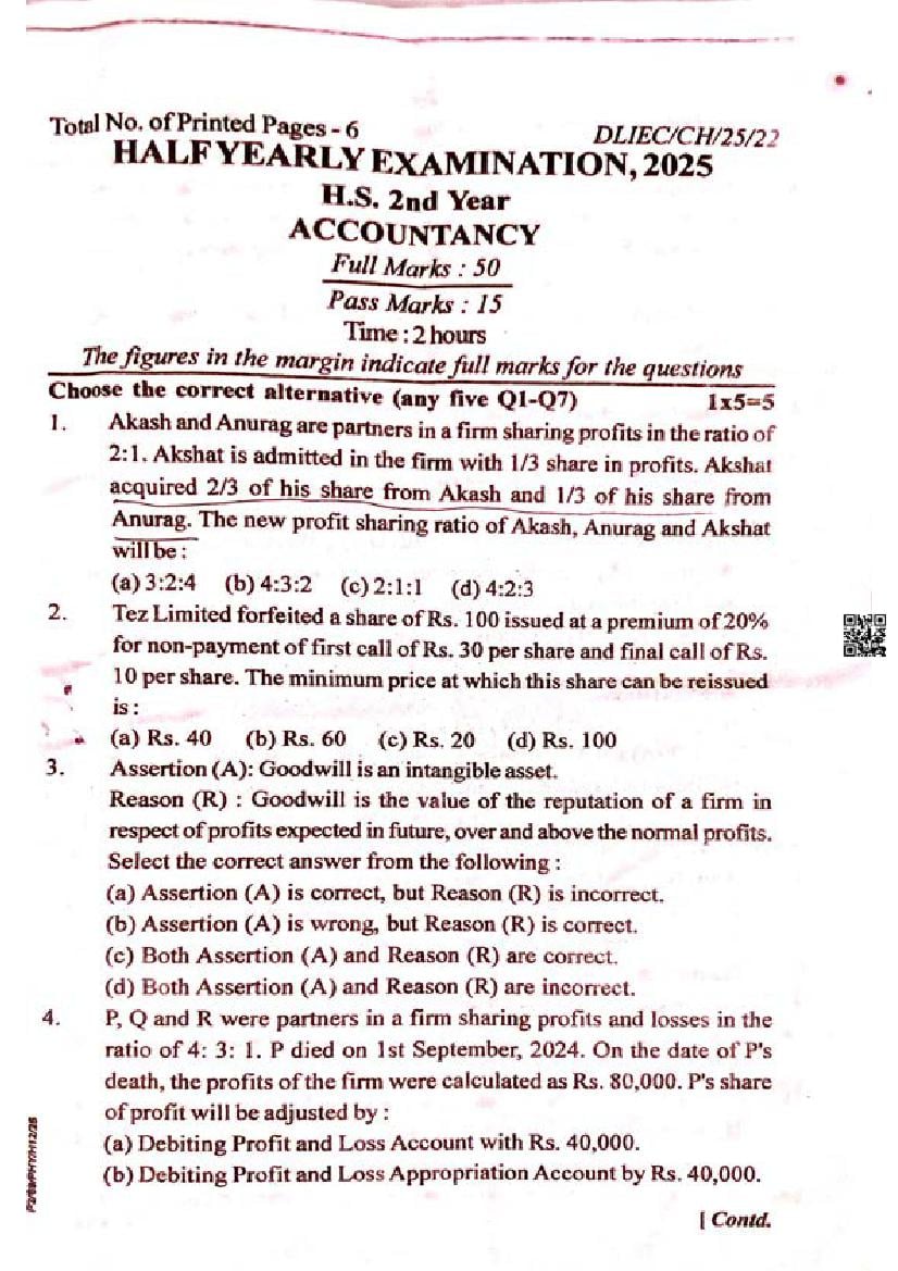 | Paper Here | Assam HS 2nd Year Half Yearly Question Paper Accountancy |