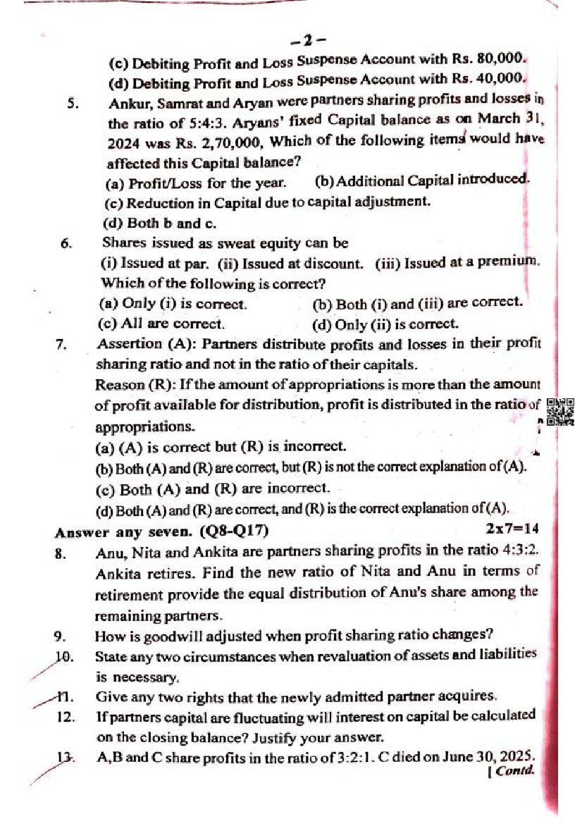 Assam Class 12 Accountancy Half Yearly Question Paper 2025