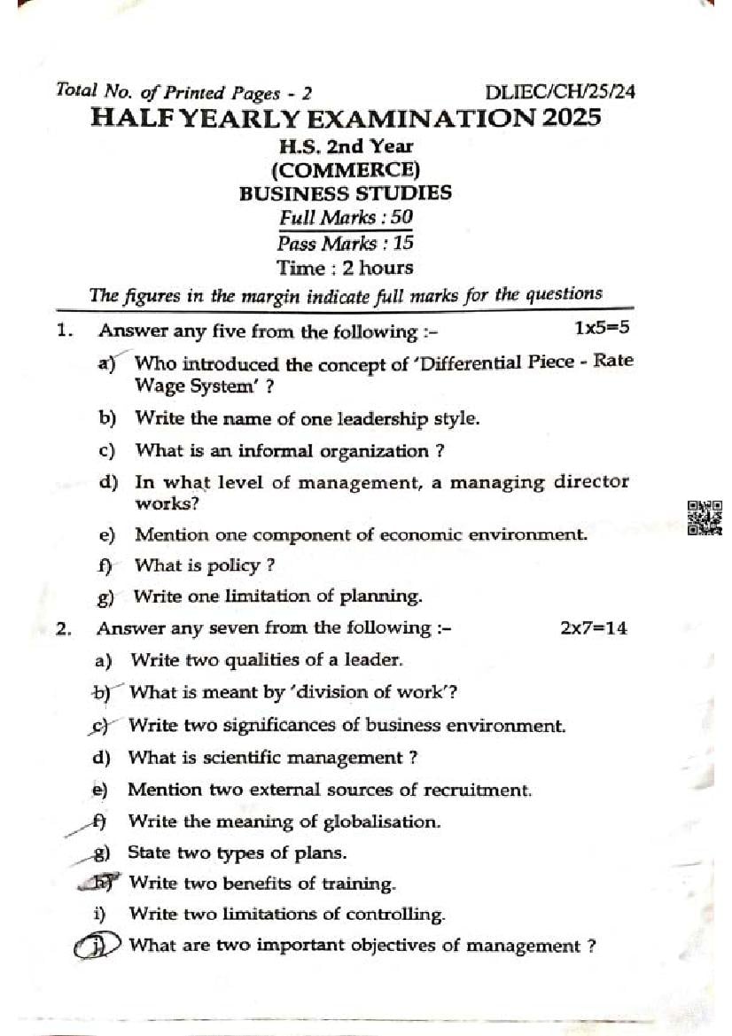 | Paper Here | Assam HS 2nd Year Half Yearly Question Paper Business Studies |