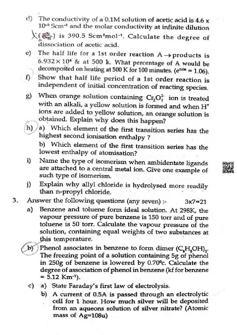 The half yearly question paper for assam board class 12 (or HS 2nd Year std) for Chemistry subject is as follows.