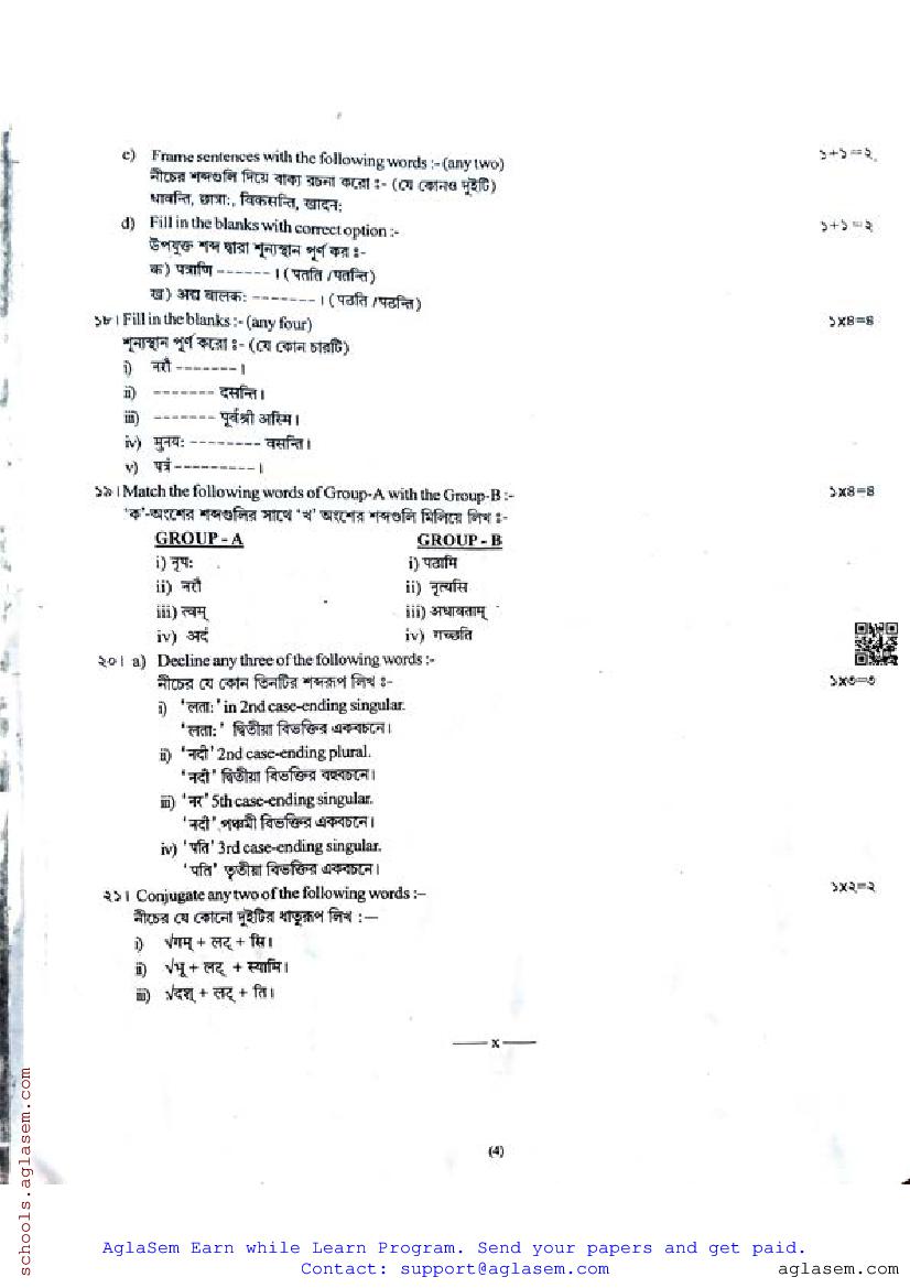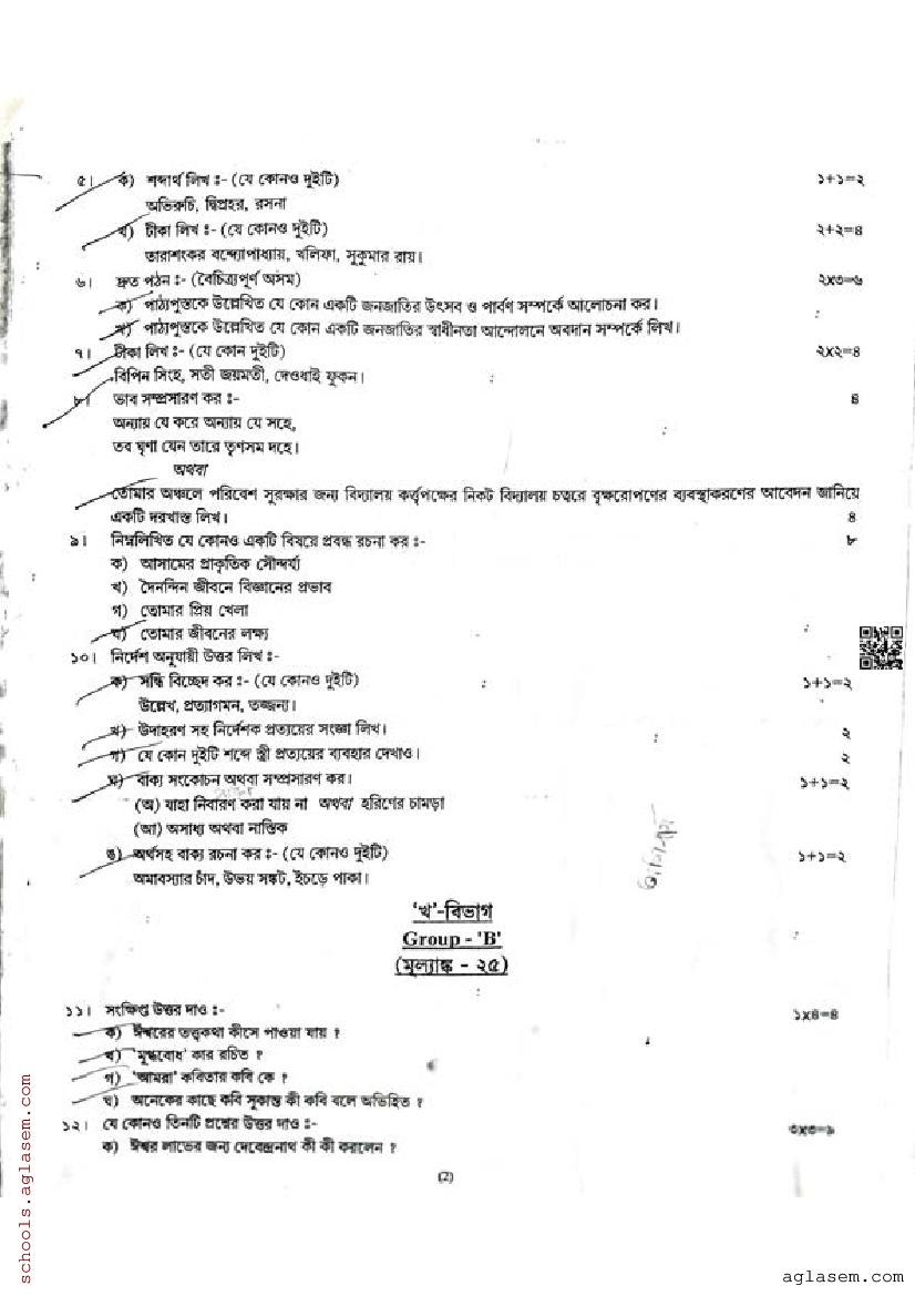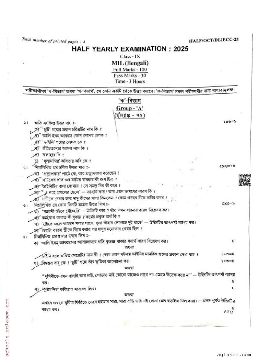 The half yearly question paper for assam board class 9 (or 9th Std std) for Bengali subject is as follows.