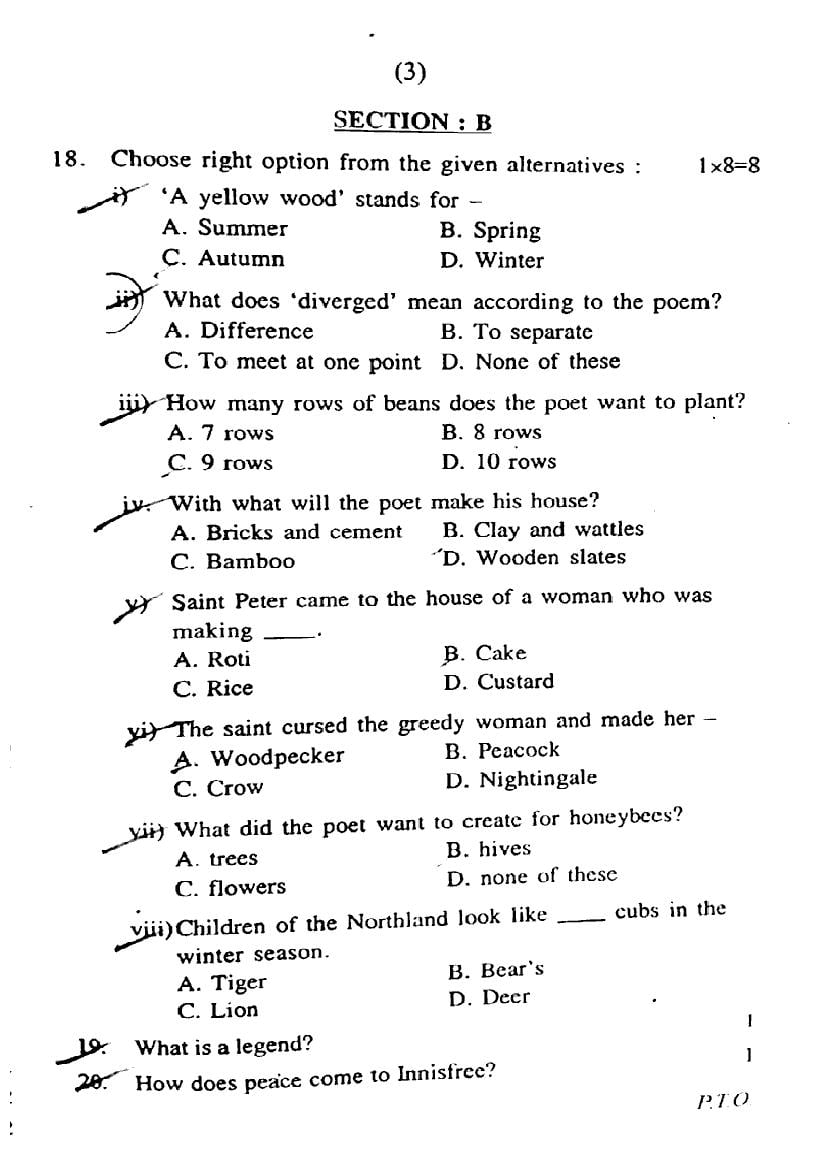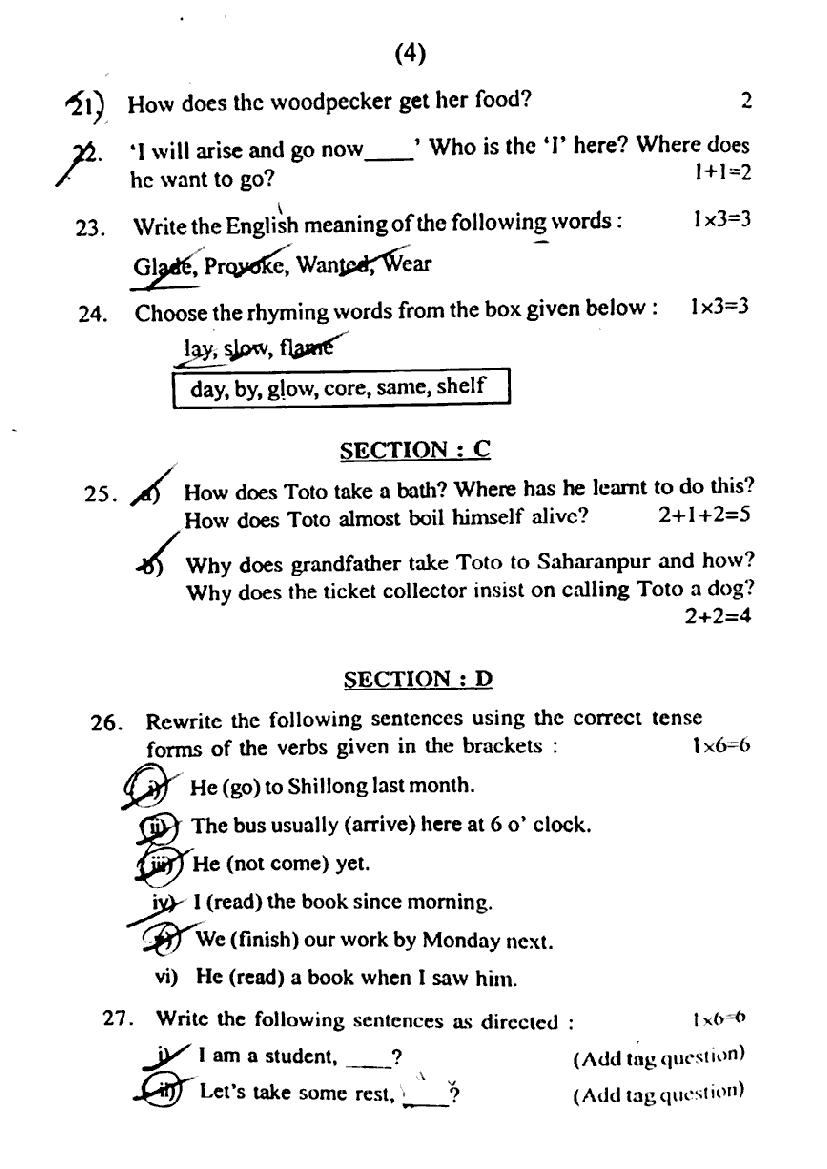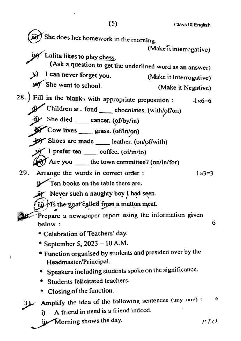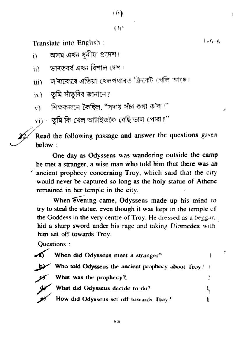 The half yearly question paper for assam board class 9 (or 9th Std std) for English subject is as follows.