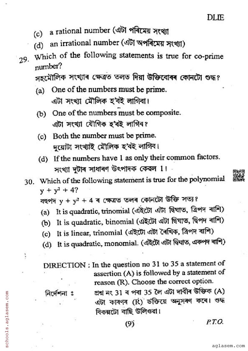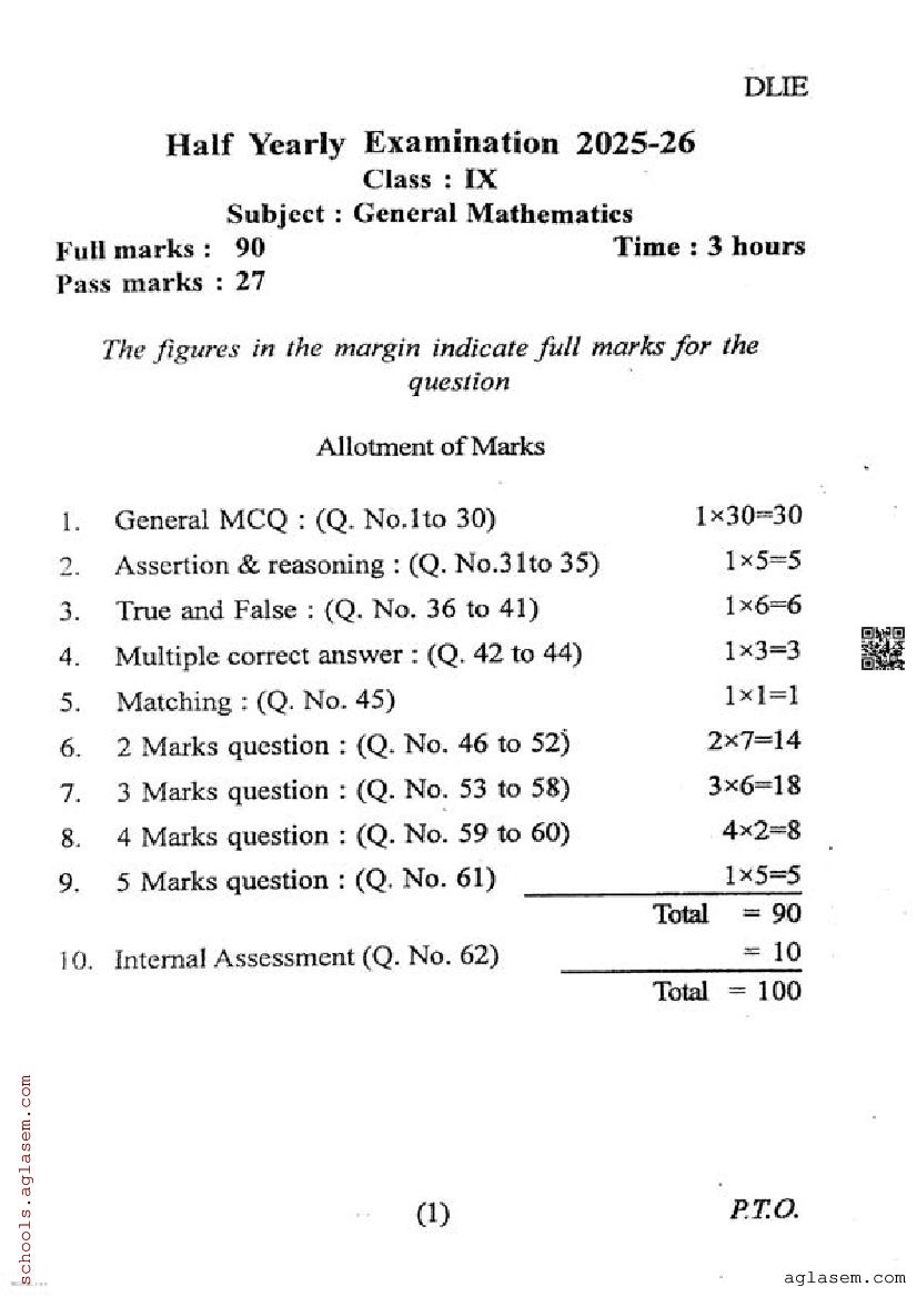The half yearly question paper for assam board class 9 (or 9th Std std) for General Mathematics subject is as follows.