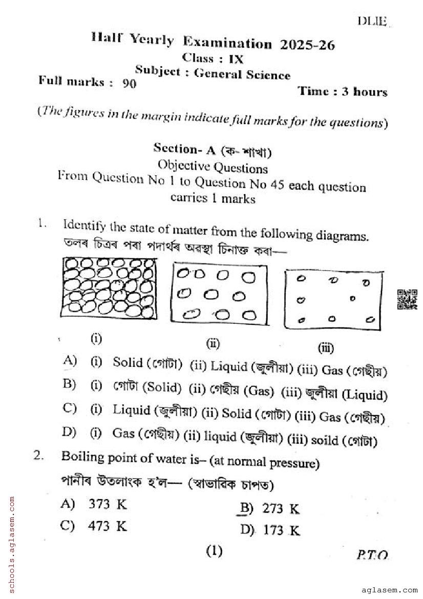 The half yearly question paper for assam board class 9 (or 9th Std std) for General Science subject is as follows.