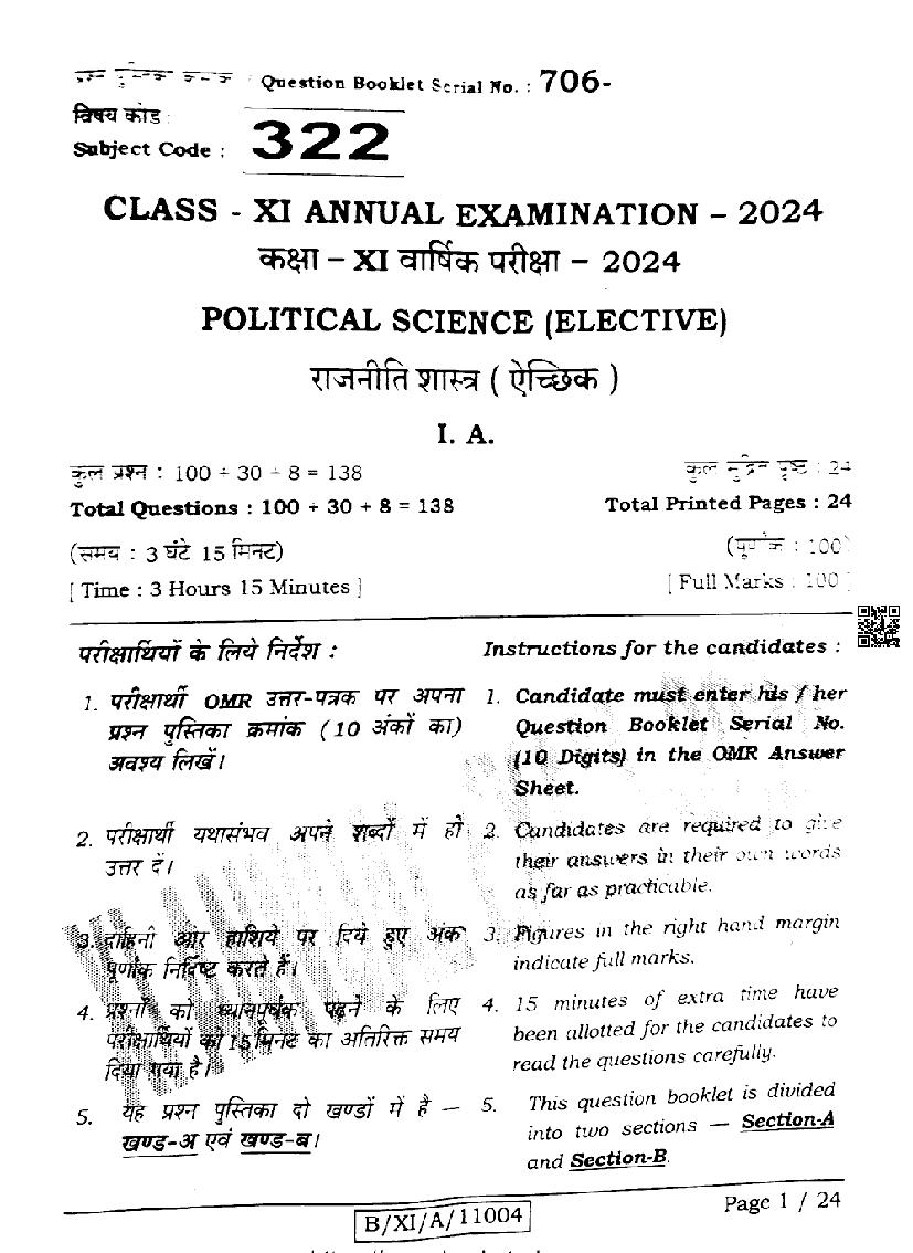 Bihar Board Class 11 Political Science Question Paper 2024 PDF Download Link – Click Here to Download Question Paper PDF