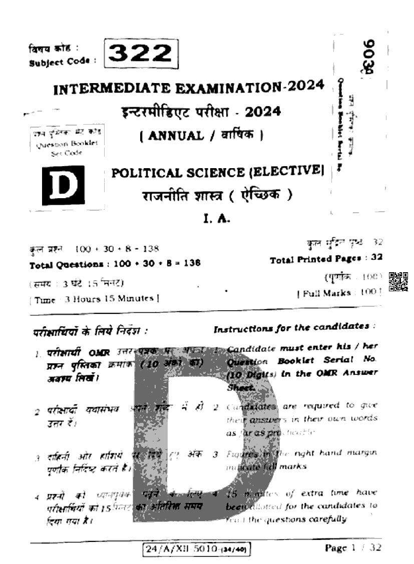 Bihar Board Class 12 Political Science Question Paper 2024 PDF Download Link – Click Here to Download Question Paper PDF
