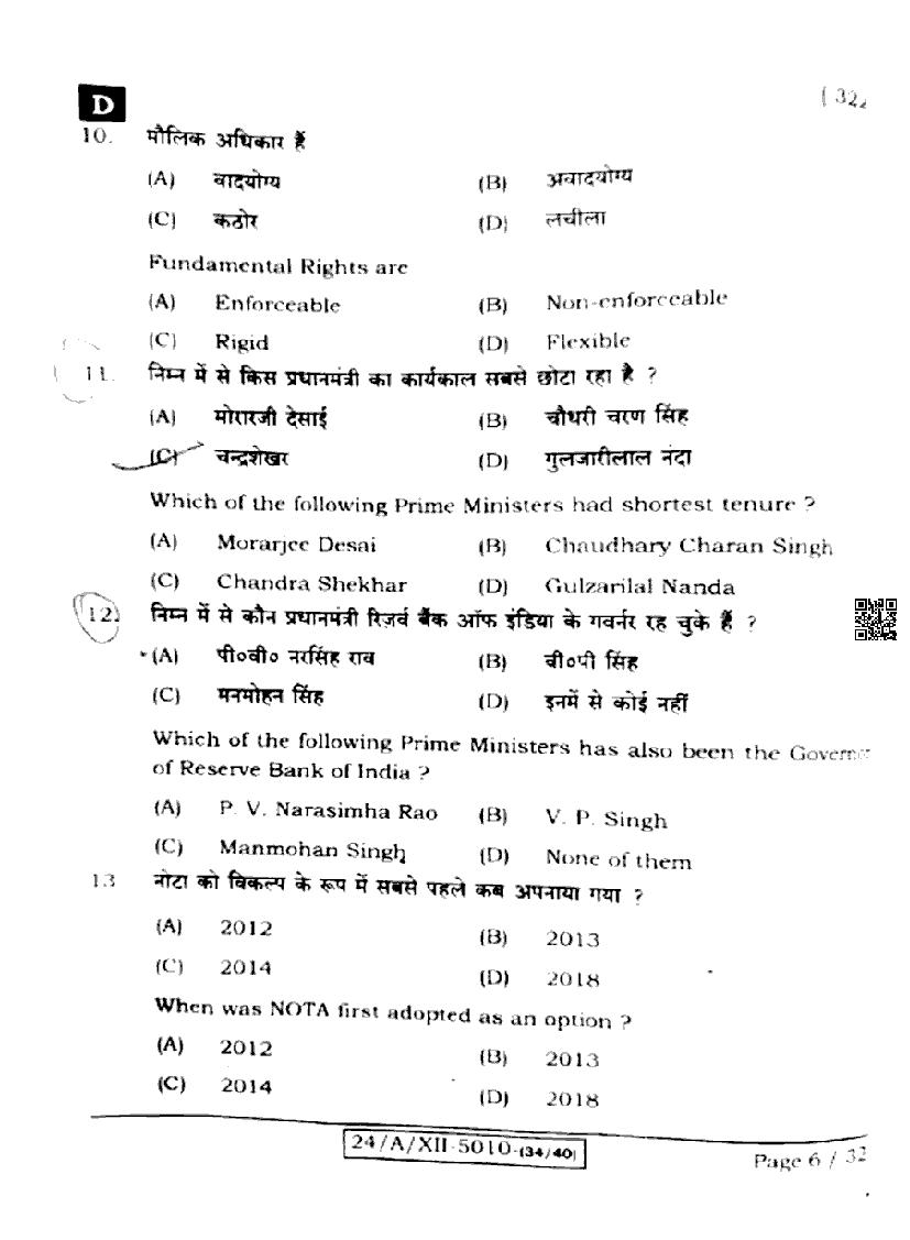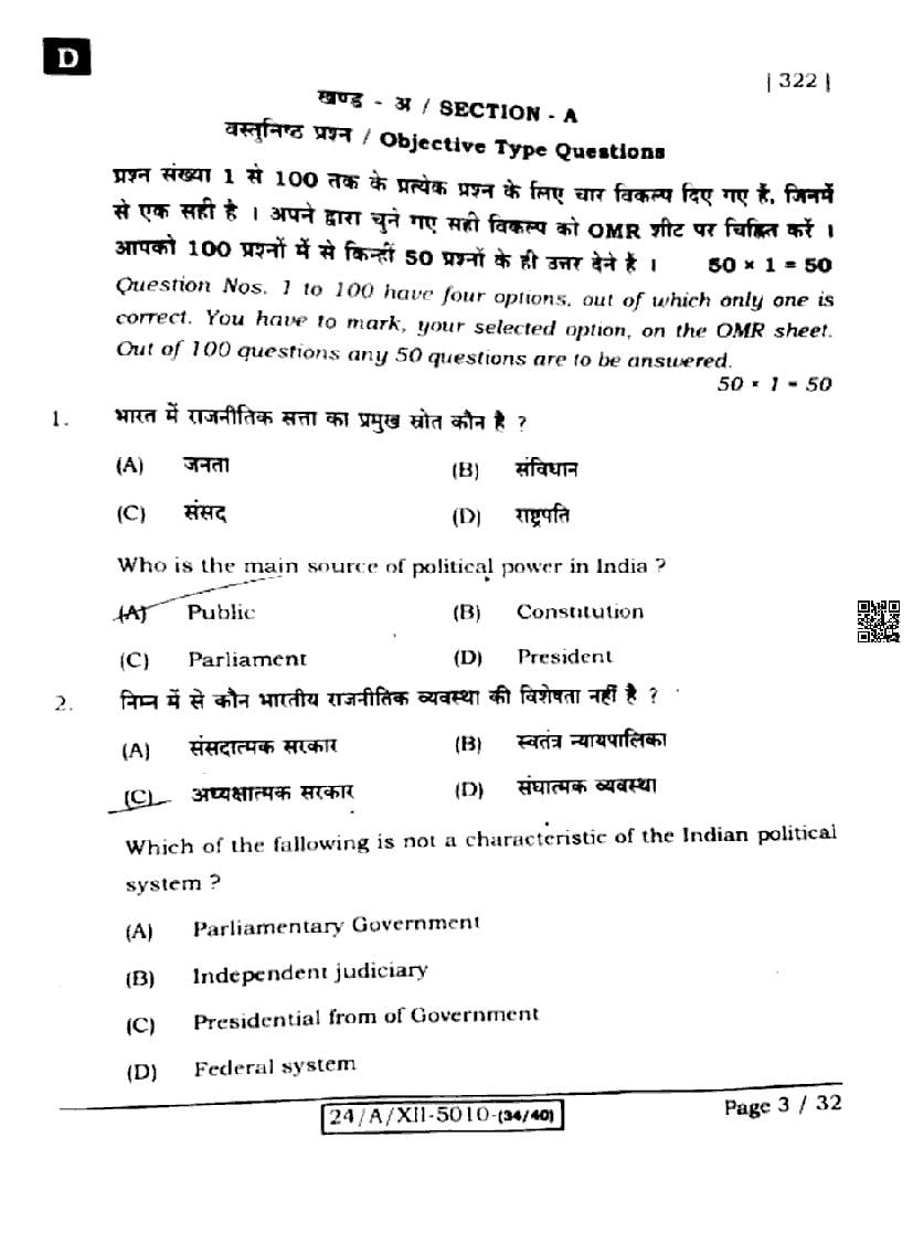 Bihar Board Class 12 Political Science Question Paper 2024 PDF