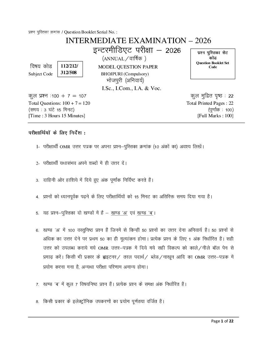 Bihar Board Class 12th Model Paper 2026 Bhojpuri View Download