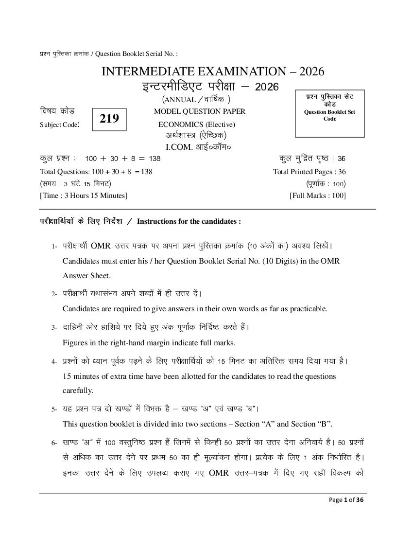Bihar Board 12th Economics (Comm) Model Paper 2026 PDF