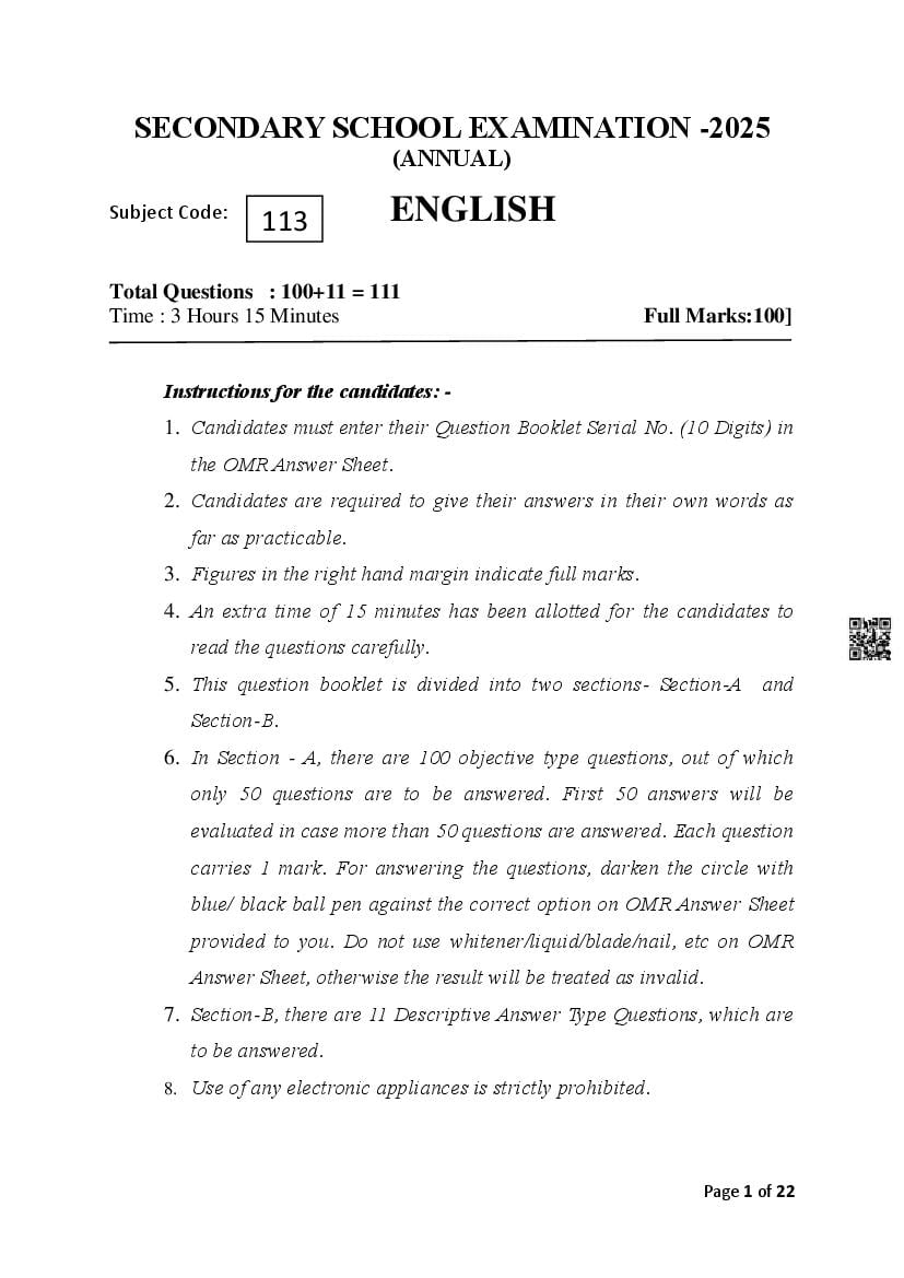 Bihar Board Class 10 English Question Paper 2025 PDF Download Link – Click Here to Download Question Paper PDF