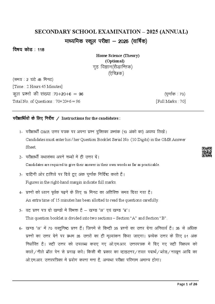 Bihar Board 10th Question Paper 2025 Home Science View Download