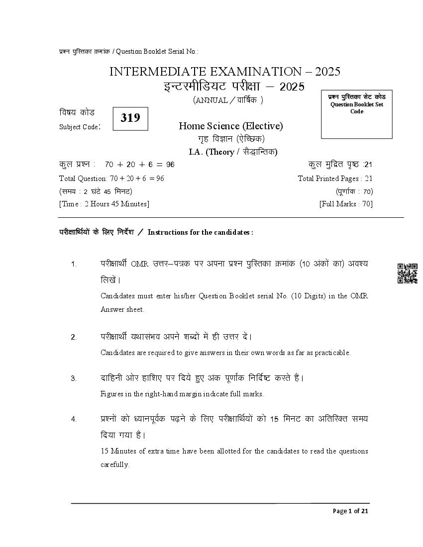 Bihar Board 12th Question Paper 2025 Home Science View Download