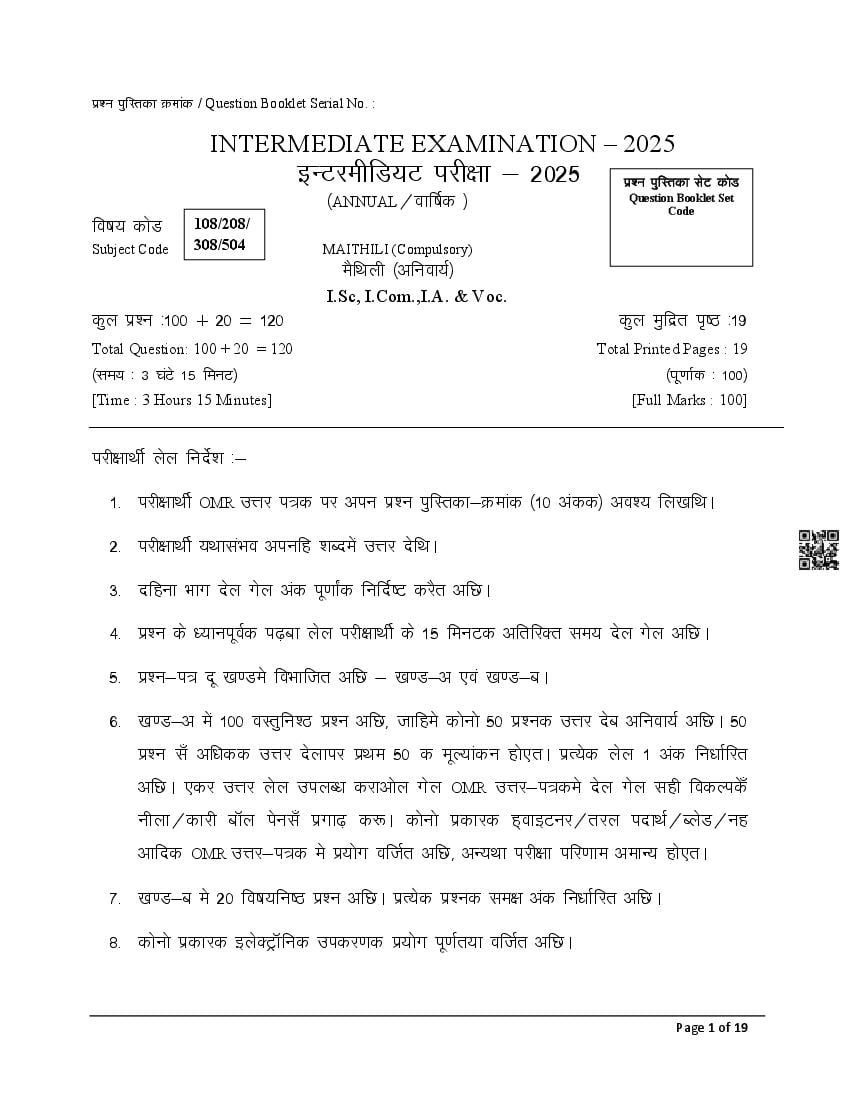 Bihar Board 12th Question Paper 2025 Maithli View Download