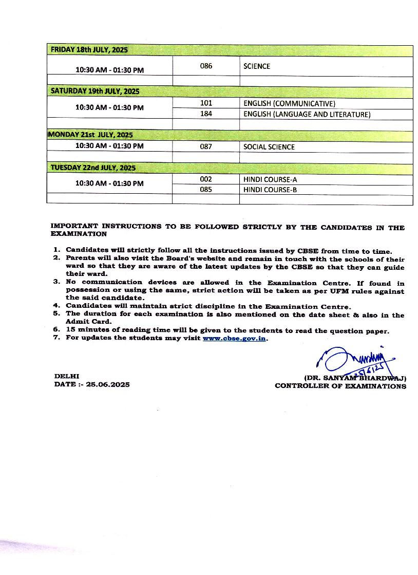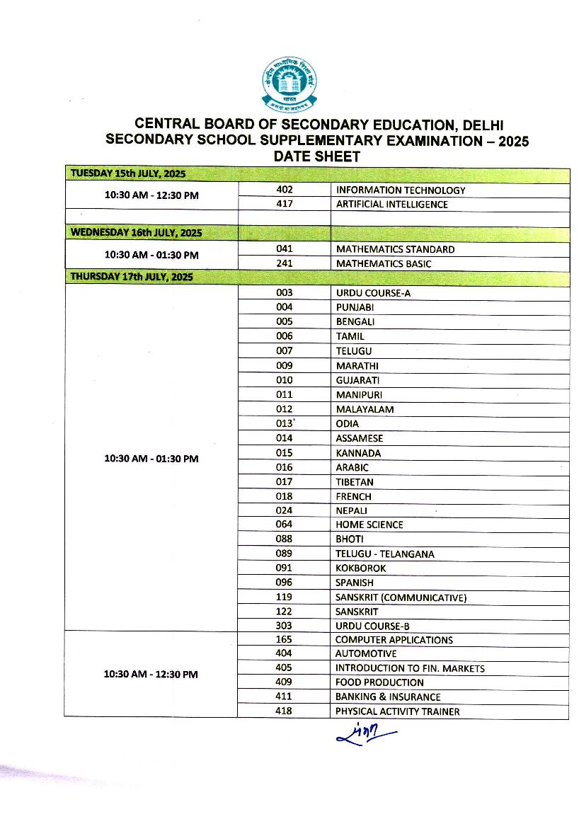 CBSE Class 10 Compartment Date Sheet 2025 PDF Download – Click here to download the CBSE 10th Compartment Exam Date