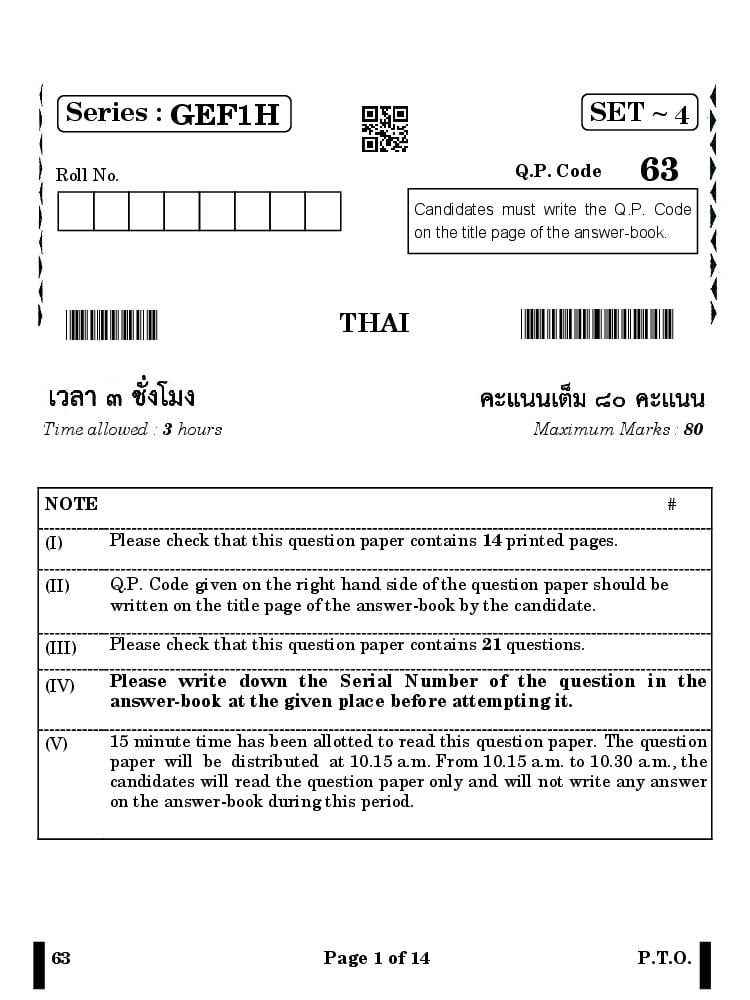 CBSE Class 10 Thai Question Paper 2024 PDF Download Link – Click Here to Download Question Paper