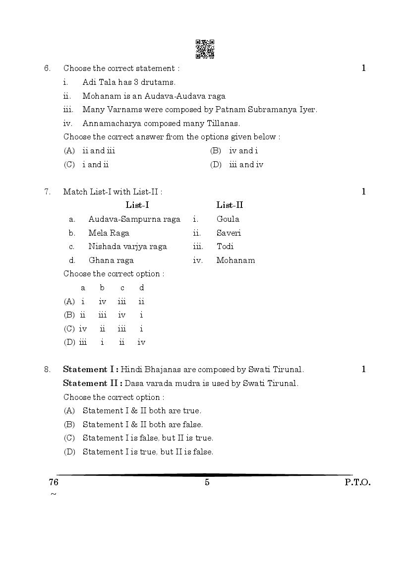 CBSE Class 12 Carnatic Music Question Paper 2024 PDF Download Link – Click Here to Download Question Paper