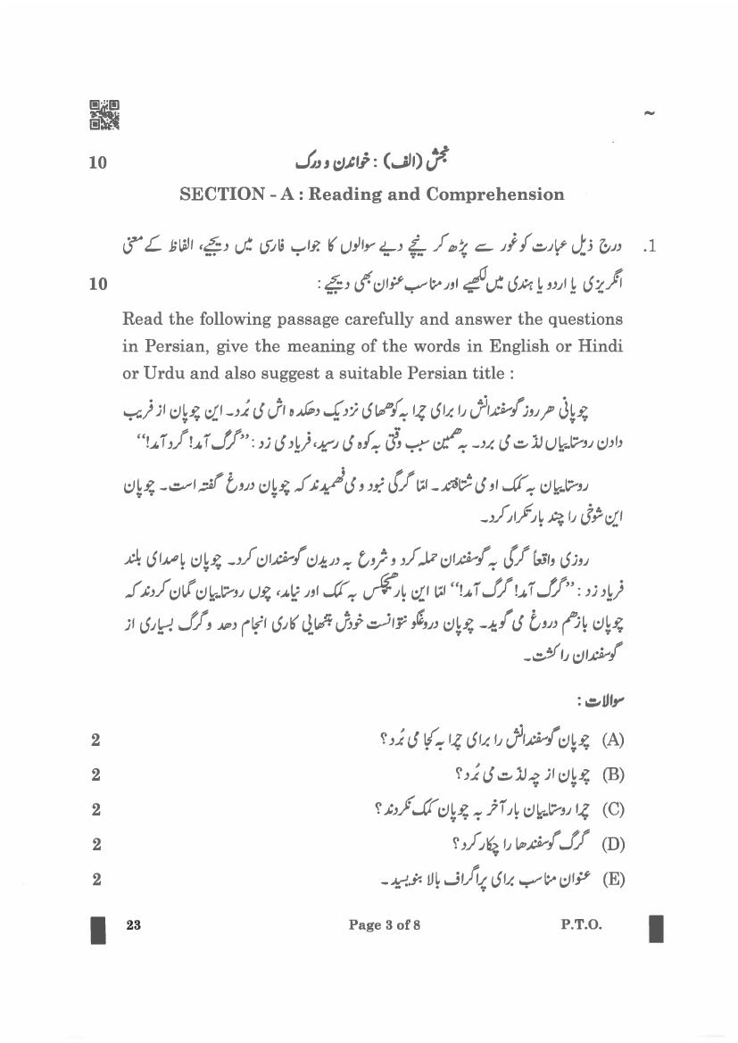 The CBSE question paper for class 12 Persian of the exam held in past years is as follows.