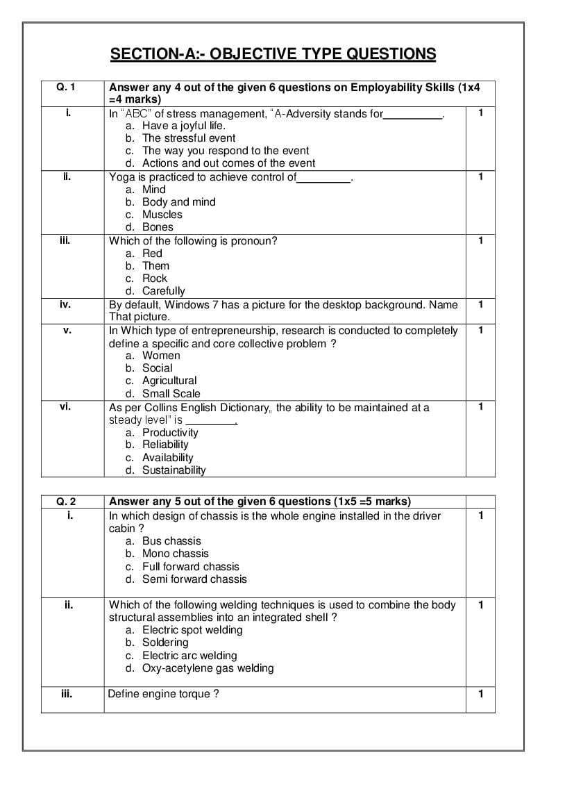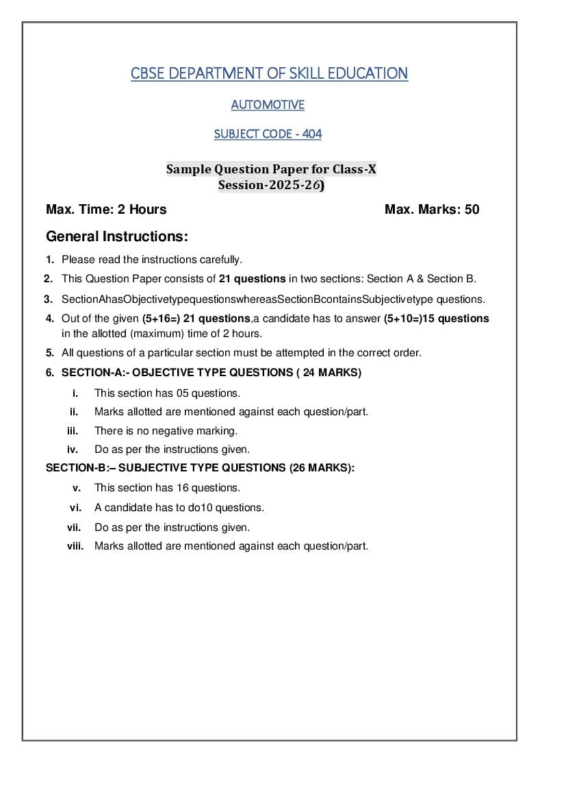 The complete CBSE class 10 Automotive sample paper 2026 is as follows. However the download link for cbse sample paper Automotive class 10 marking scheme is given above.