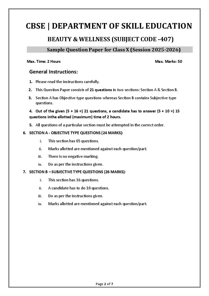 The complete CBSE class 10 Beauty and Wellness sample paper 2026 is as follows. However the download link for cbse sample paper Beauty and Wellness class 10 marking scheme is given above.