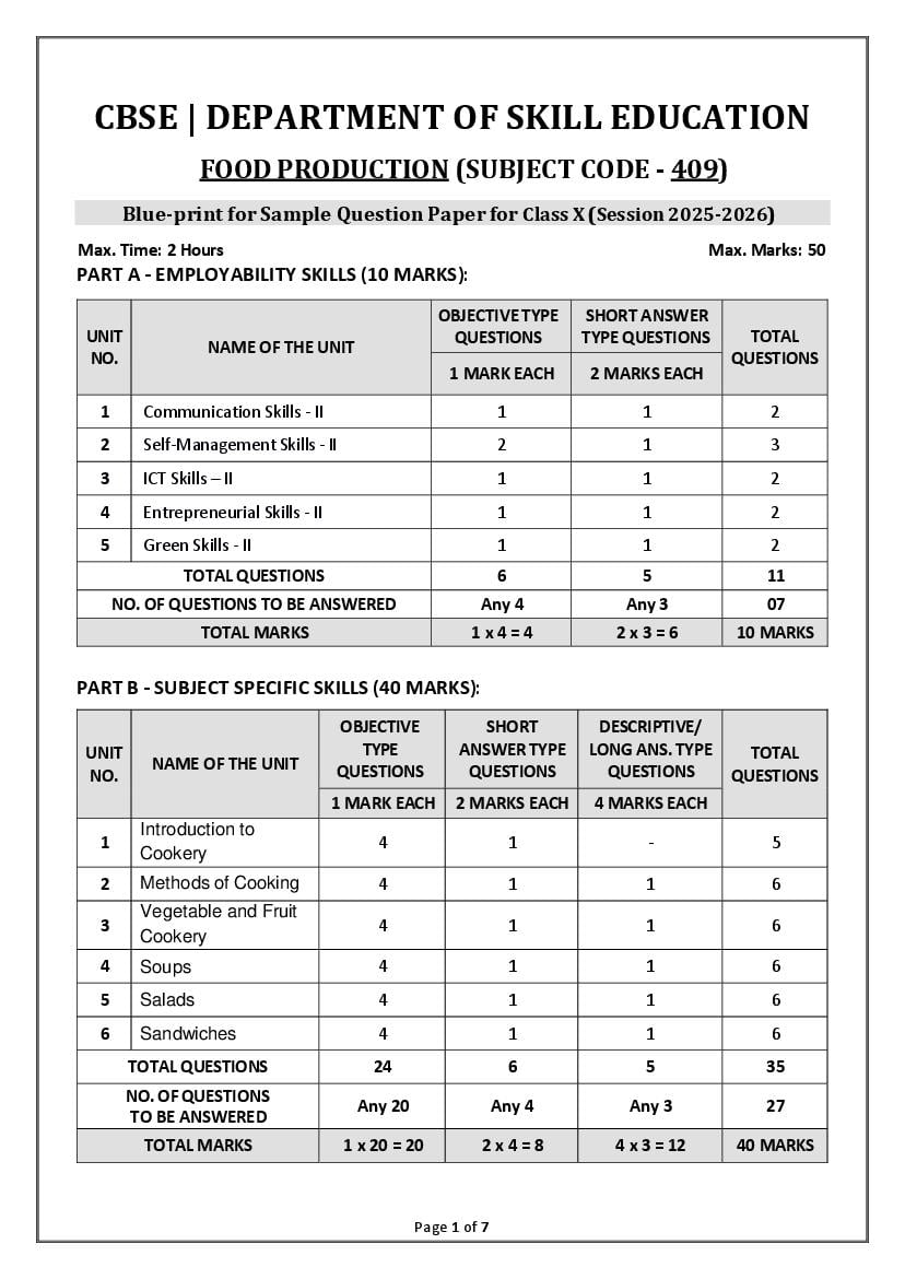 CBSE Class 10 Sample Paper 2026 for Food Production View Download