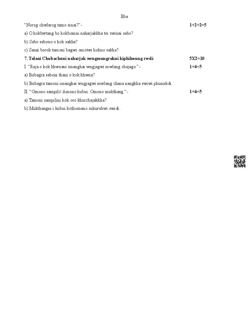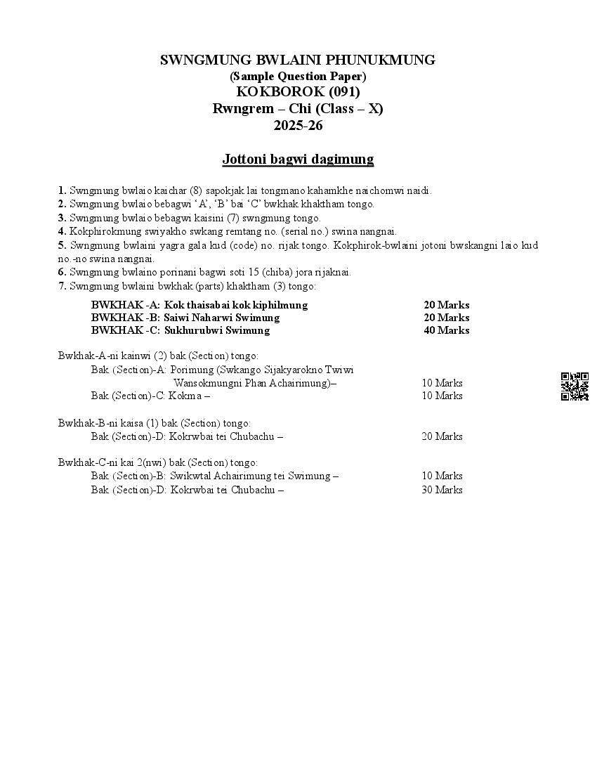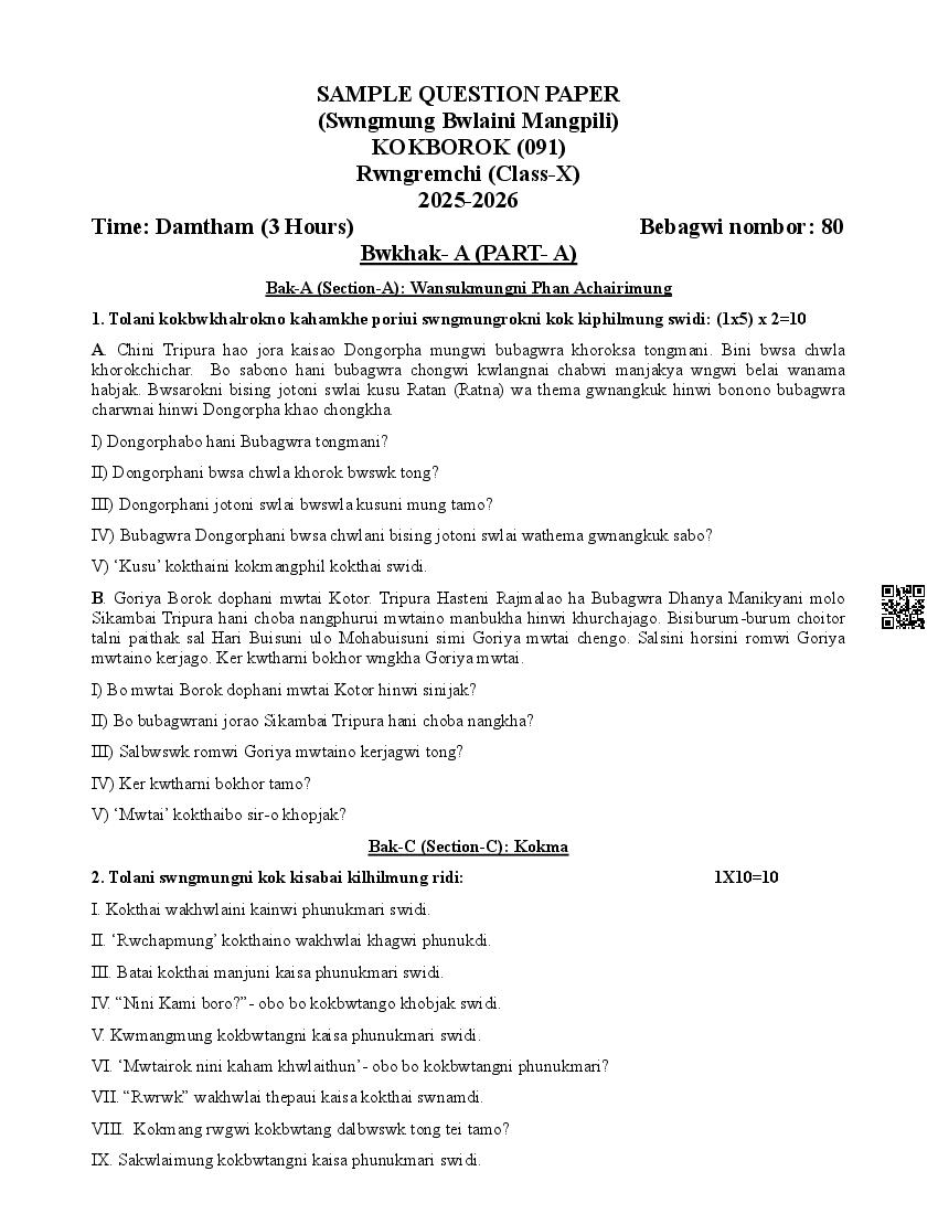 The complete CBSE class 10 Kokborok sample paper 2026 is as follows. However the download link for cbse sample paper Kokborok class 10 marking scheme is given above.