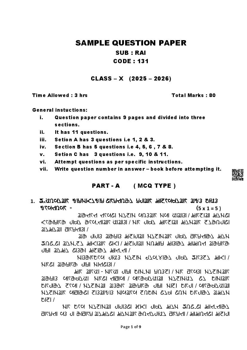 The CBSE Class 10 Rai Sample Paper 2026 has been officially released by the Central Board of Secondary Education. You can download the Class 10 Rai Sample Paper 2026 with Solutions PDF from Aglasem. This CBSE Class 10 Sample Paper for Rai features model questions that align with the latest Rai syllabus. Additionally, the Rai sample paper solution includes correct answers and a marking scheme for each question. To achieve the best possible marks in your board exams, make sure to study your NCERT textbooks and notes thoroughly, solve the Rai sample paper, and conduct a comprehensive revision.