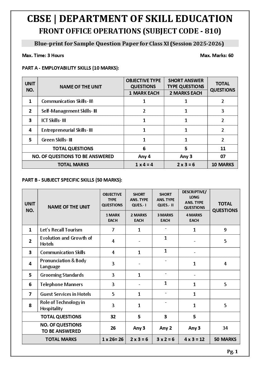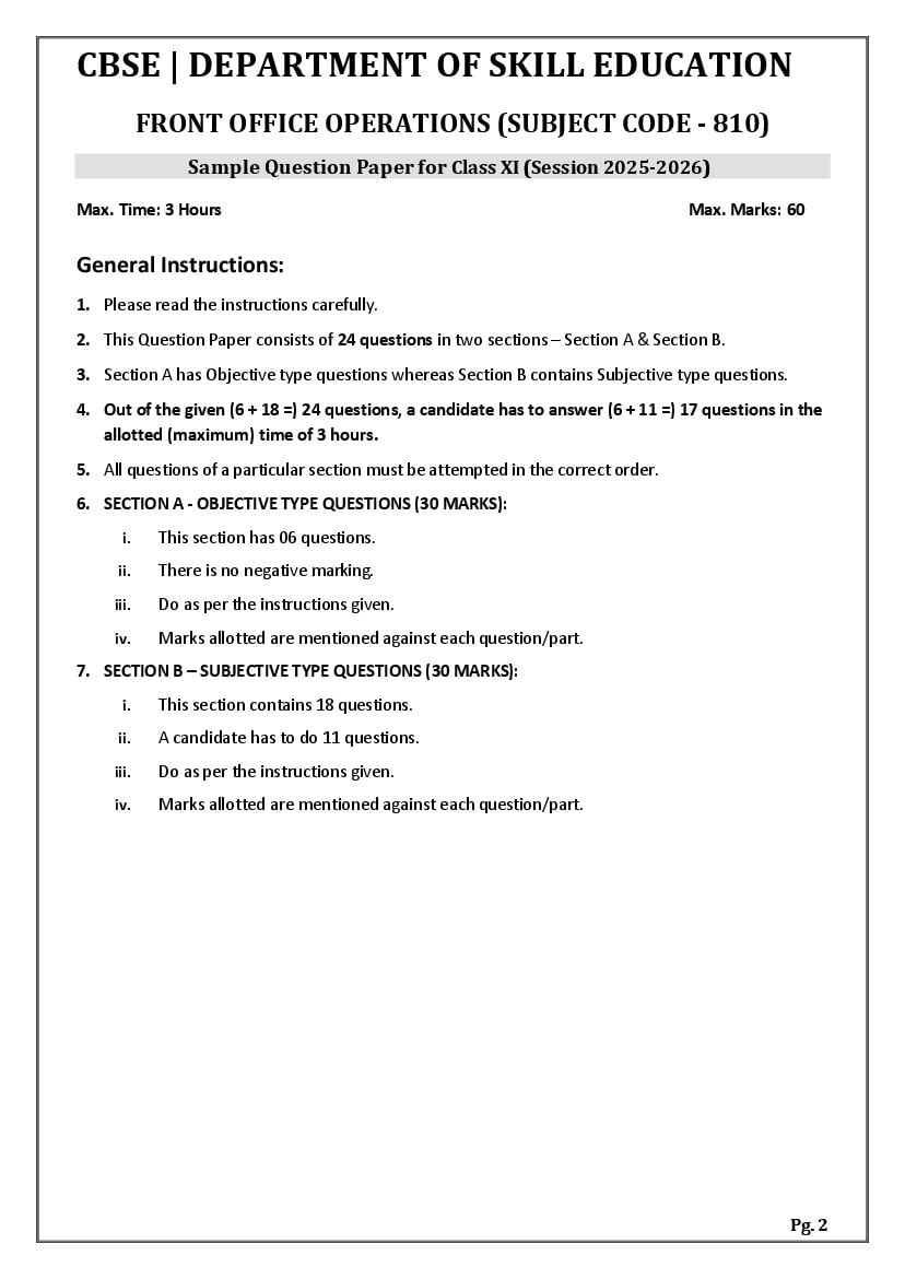 | Study Material Here | CBSE Sample Paper 2026 for Class 11 Front Office Operations |