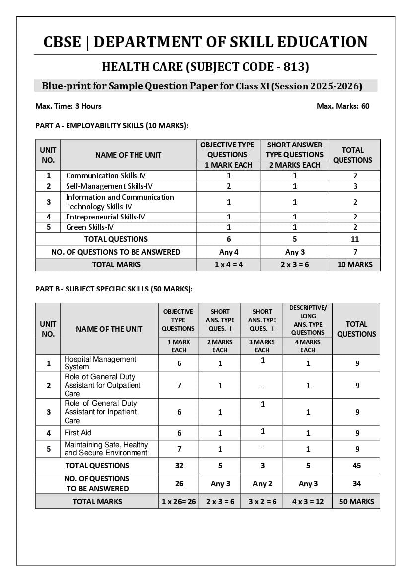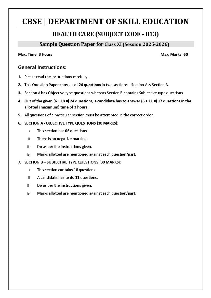 | Study Material Here | CBSE Sample Paper 2026 for Class 11 Health Care |