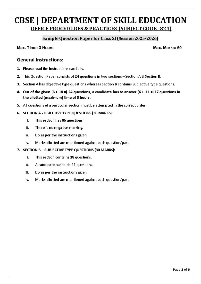 The CBSE Sample Paper for Class 11 Office Procedures and Practices is an essential resource that features model questions aligned with the Office Procedures and Practices exam pattern you will encounter in the upcoming board exams. These carefully crafted model questions reflect the various types of questions expected in the CBSE Class 11 Office Procedures and Practices question paper for 2026. Utilizing this sample paper allows you to grasp the difficulty level of the Office Procedures and Practices exam, the distribution of MCQ and subjective questions, and highlights the key chapters and questions that require your focus for success in the Class 11 Office Procedures and Practices exam.