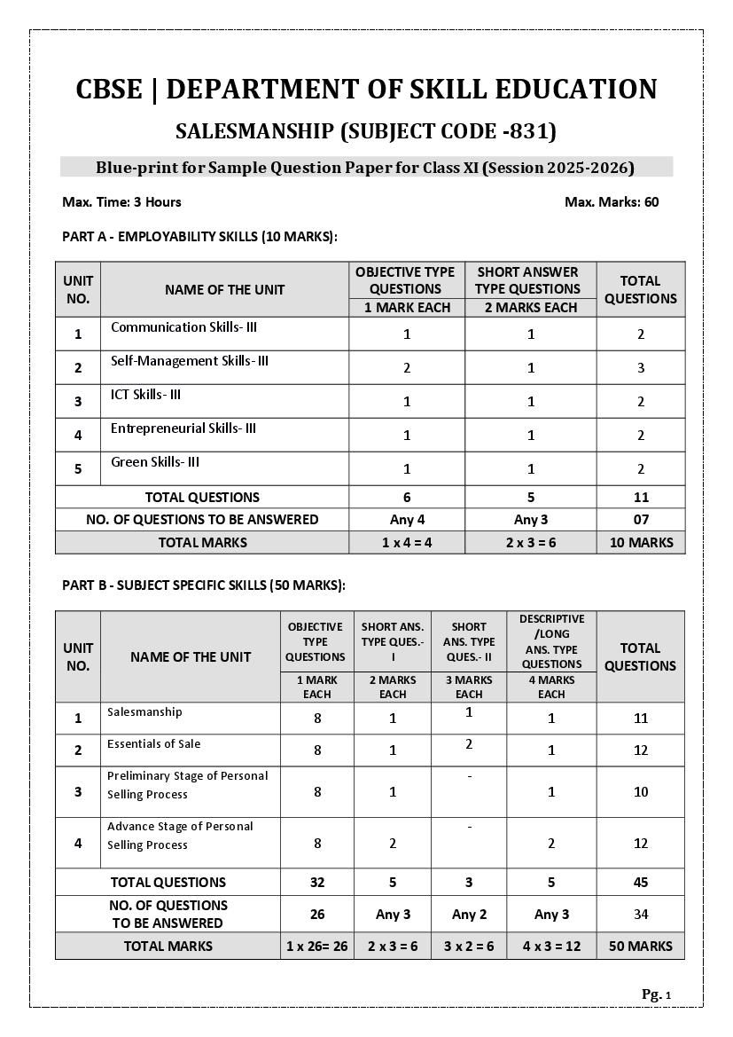 | Study Material Here | CBSE Sample Paper 2026 for Class 11 Salesmanship |