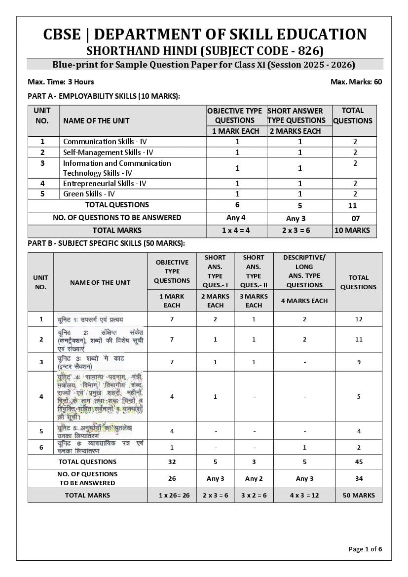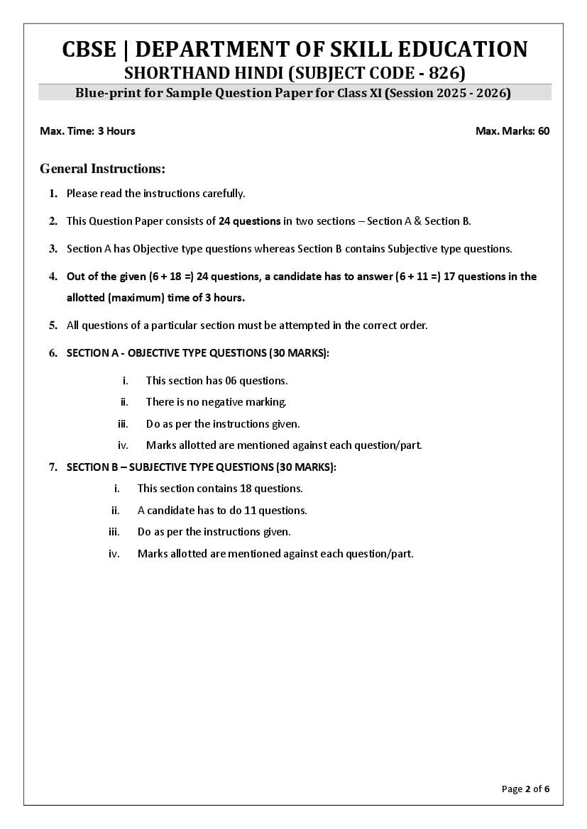 The complete CBSE class 11 Shorthand Hindi sample paper 2026 is as follows. However the download link for cbse sample paper Shorthand Hindi class 11 marking scheme is given above.