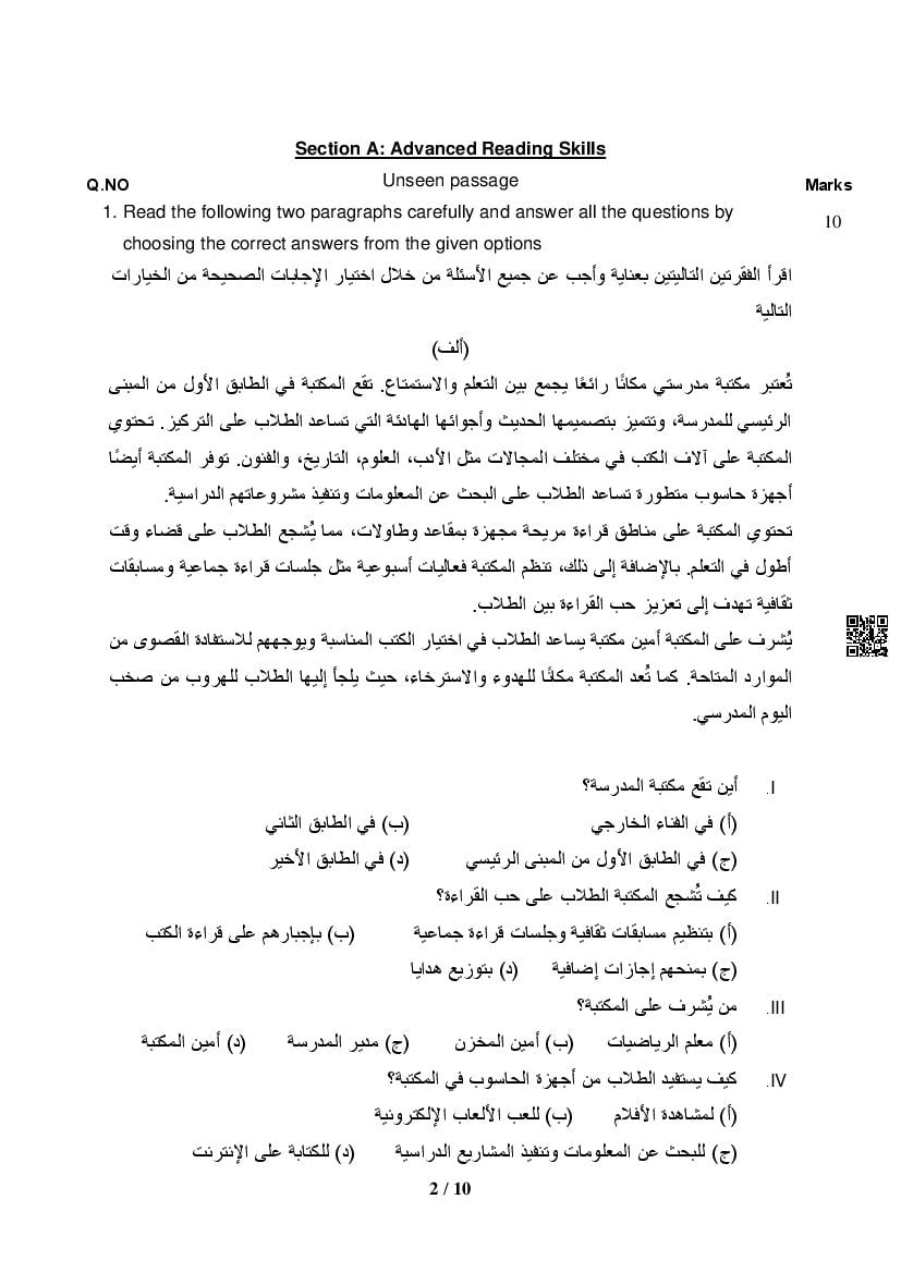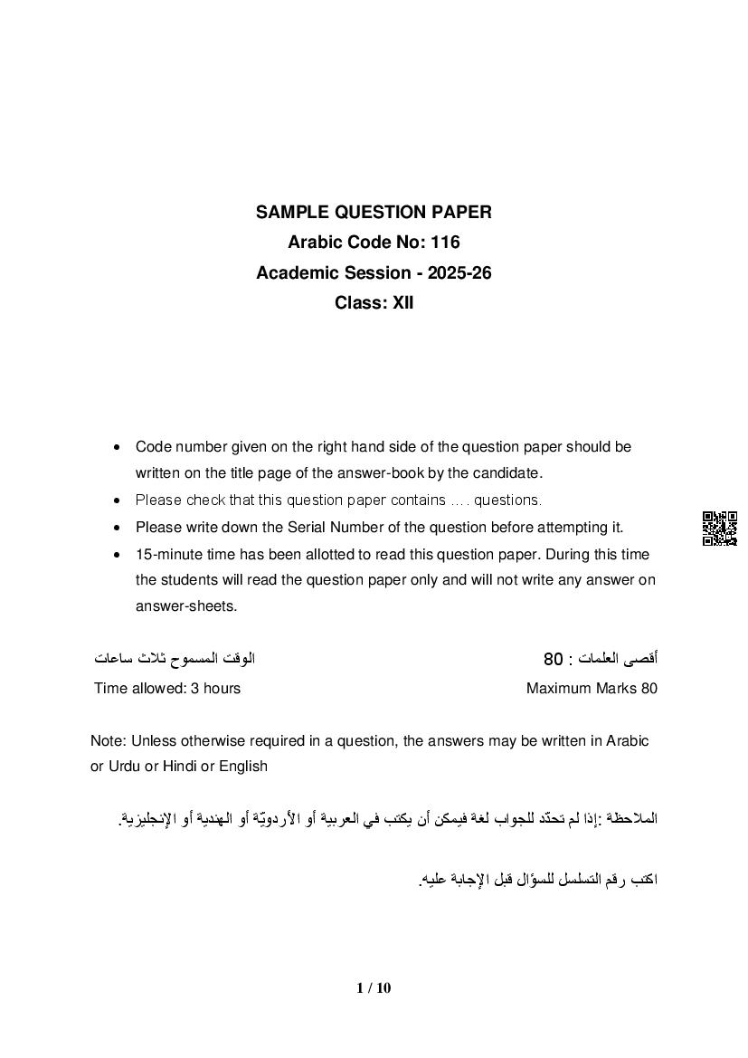 CBSE Class 12 Sample Paper 2026 for Arabic View Download