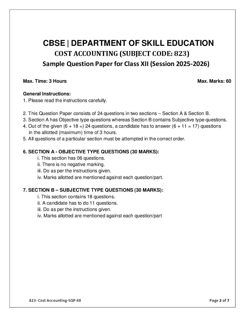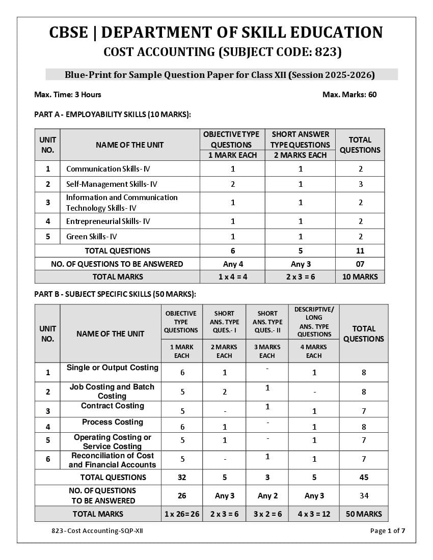 | Study Material Here | CBSE Sample Paper 2026 for Class 12 Cost Accounting |