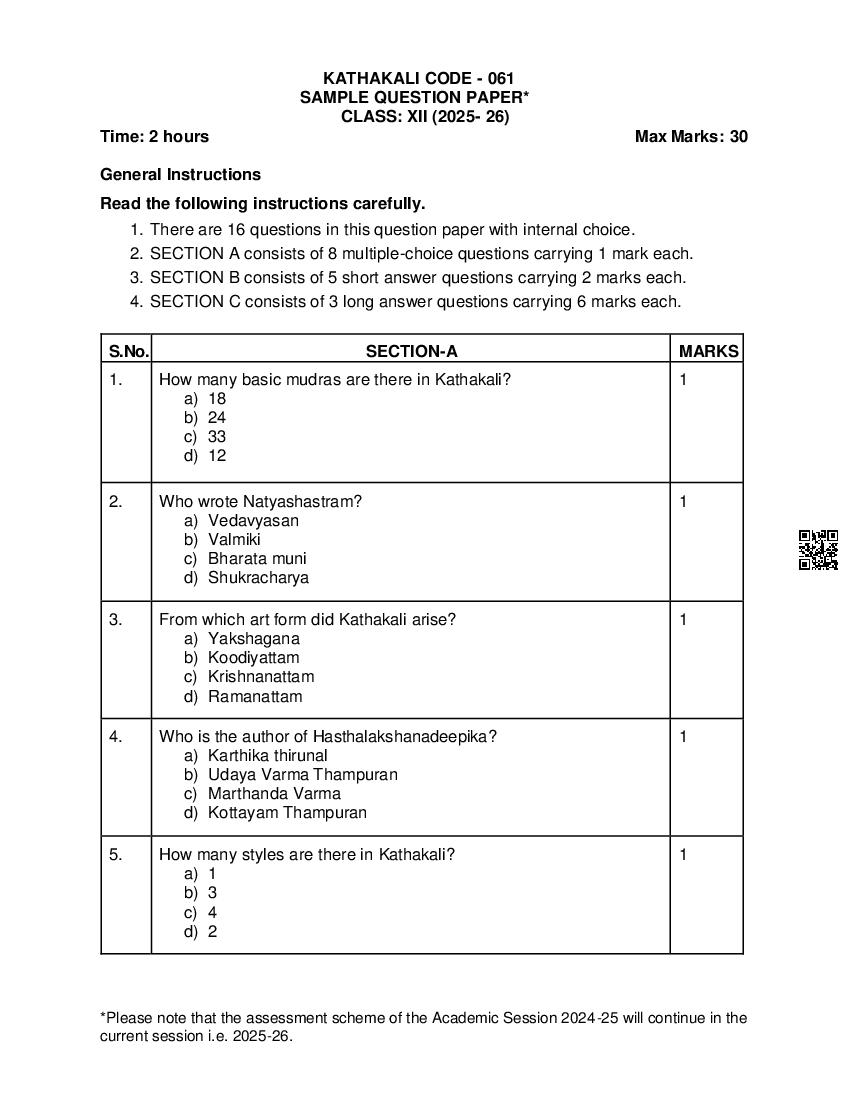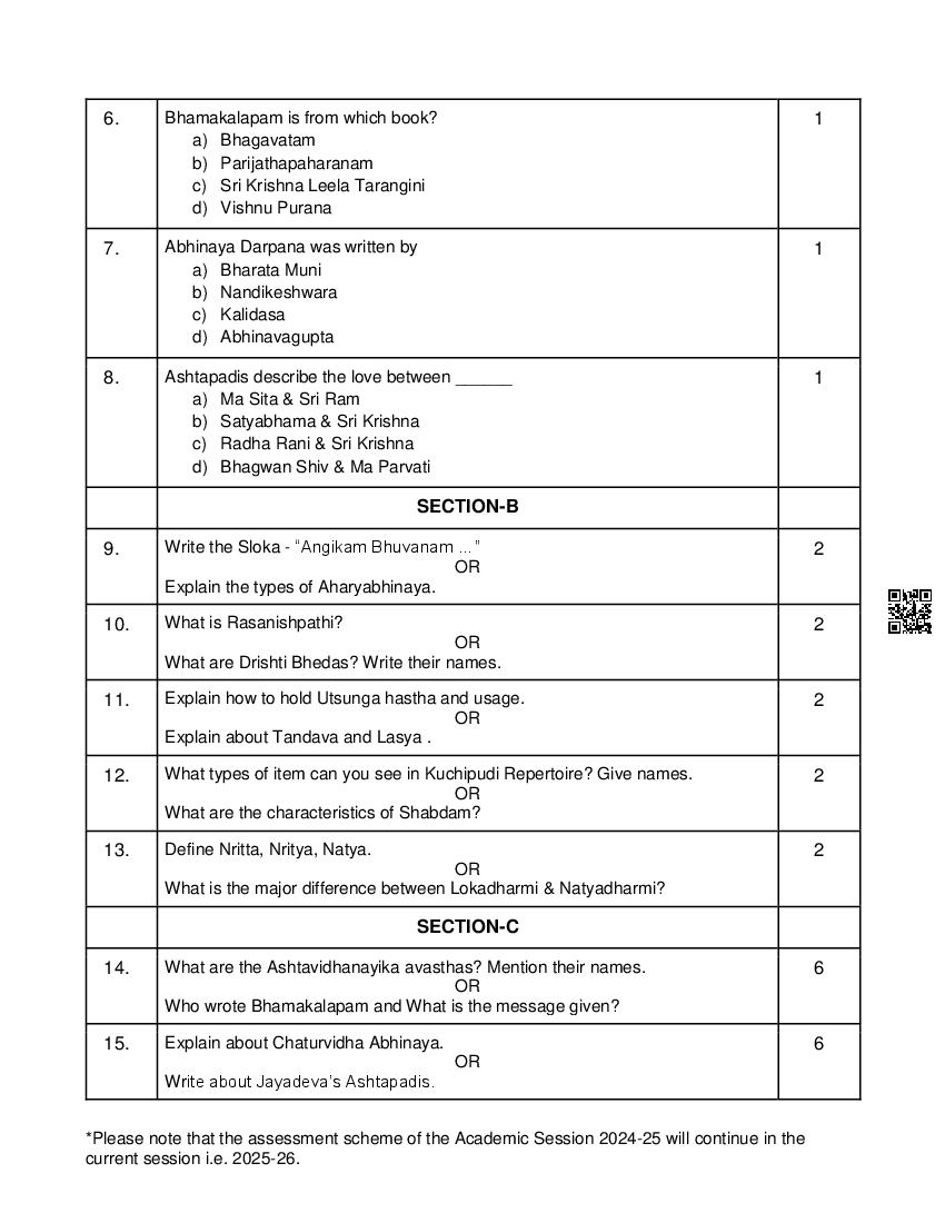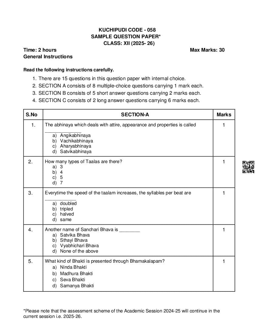 CBSE Class 12 Sample Paper 2026 for Dance - Dance - Bharatnatyam, Kathak, Kathakali, Kuchipudi, Manipuri, Odissi View Download