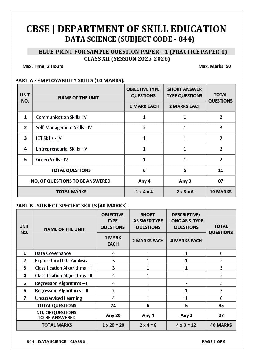 | Study Material Here | CBSE Sample Paper 2026 for Class 12 Data Science |