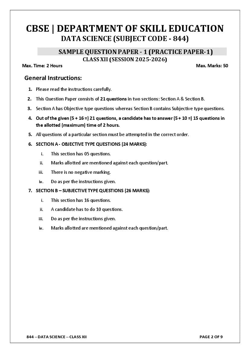 CBSE Class 12 Sample Paper 2026 for Data Science View Download