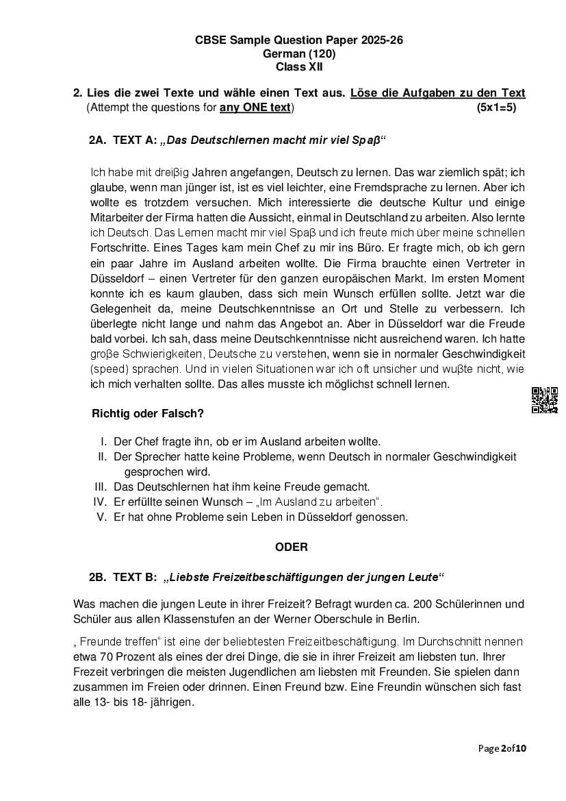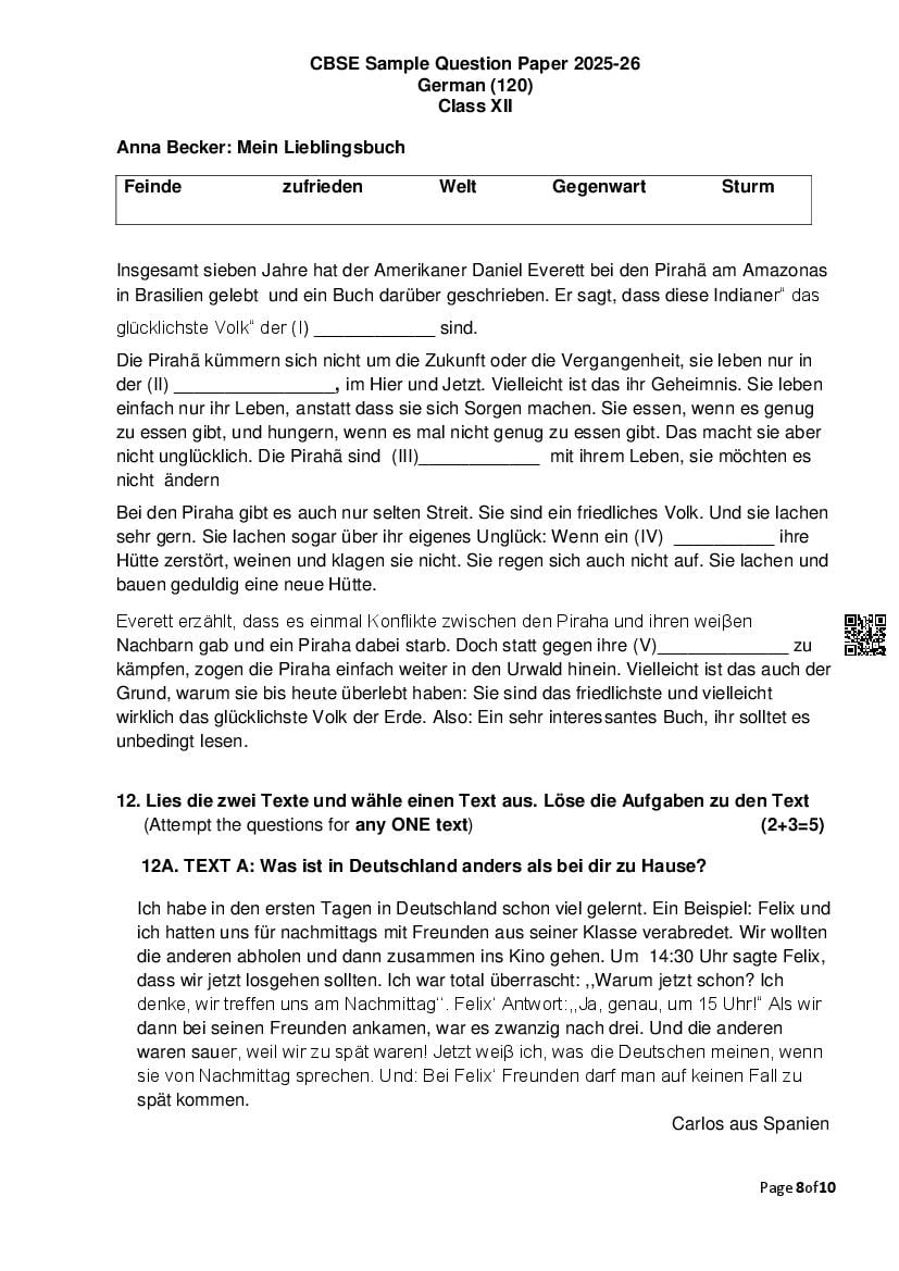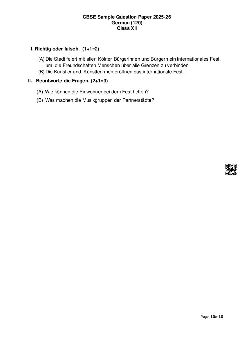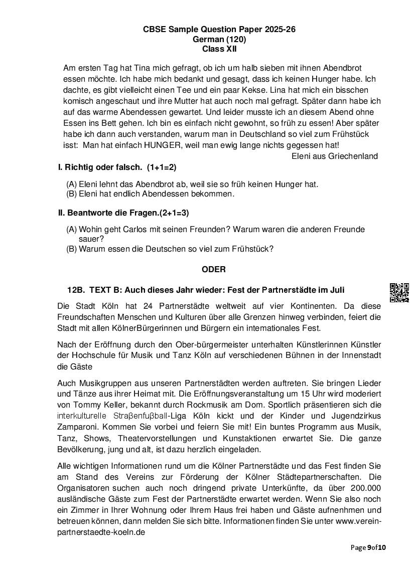 CBSE Class 12 Sample Paper 2026 for German View Download