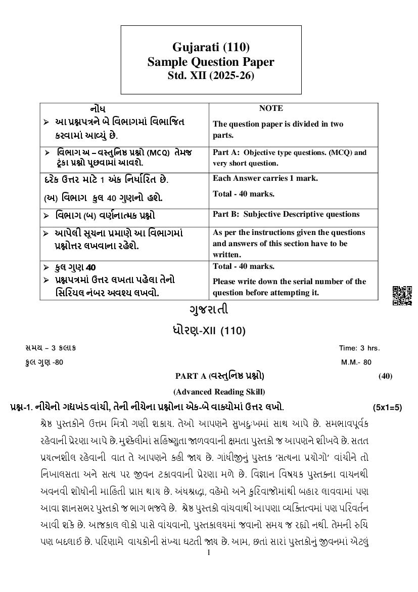 The complete CBSE class 12 Gujarati sample paper 2026 is as follows. However the download link for cbse sample paper Gujarati class 12 marking scheme is given above.