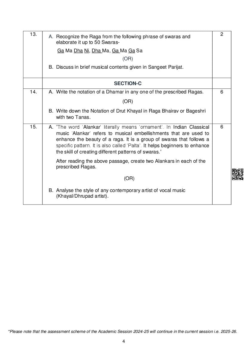 CBSE Class 12 Sample Paper 2026 for Hindustani Music Melodic, Percussion, Vocal View Download