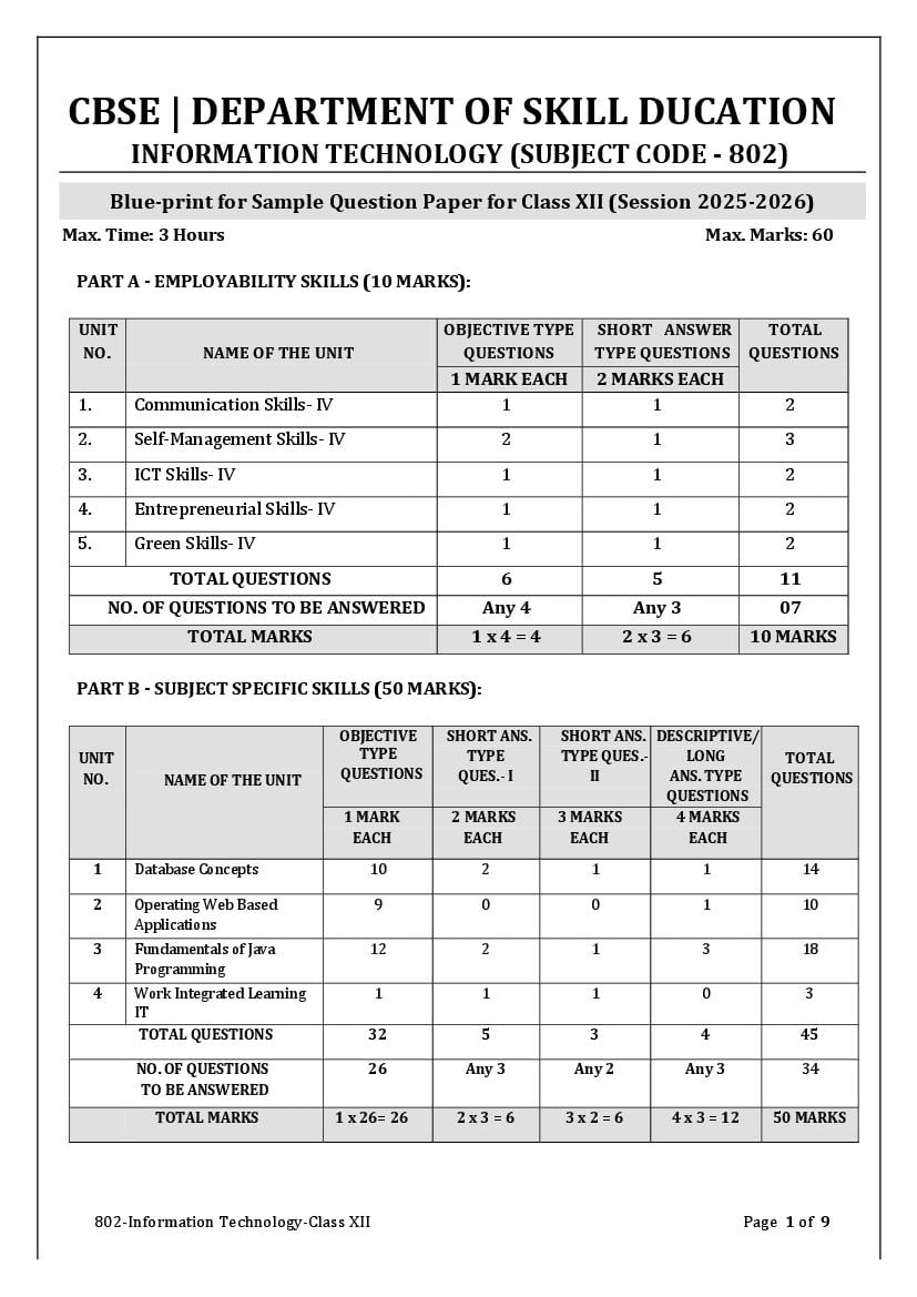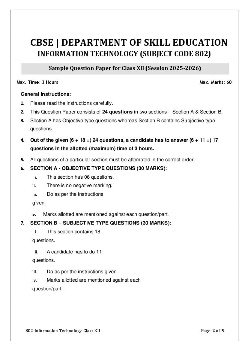CBSE Class 12 Sample Paper 2026 for Information Technology View Download
