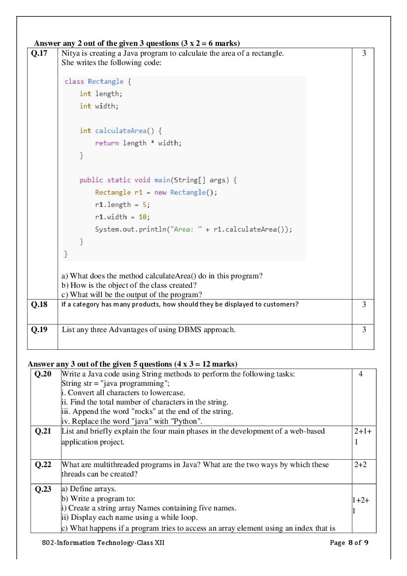 - The class 12 sample paper solutions for Information Technology subject includes the correct answers of all questions asked in the model question paper.