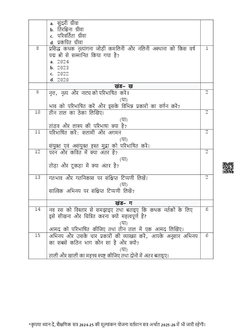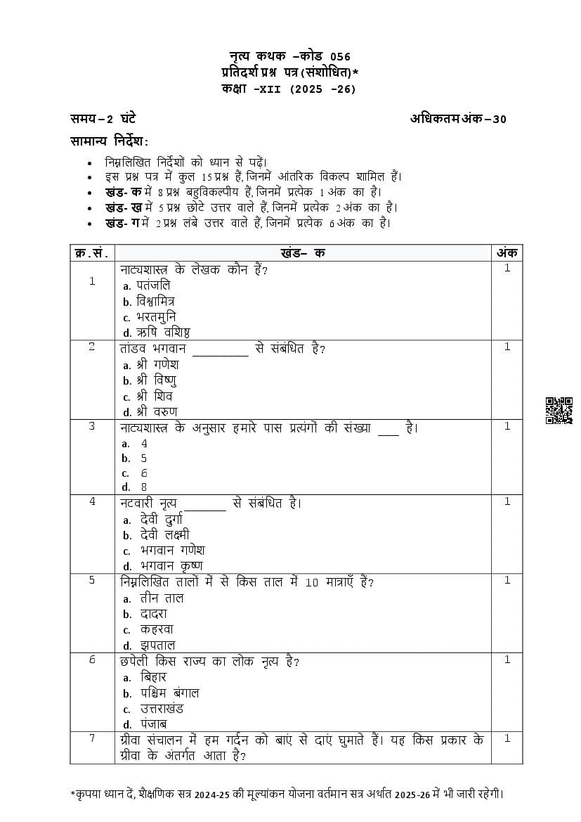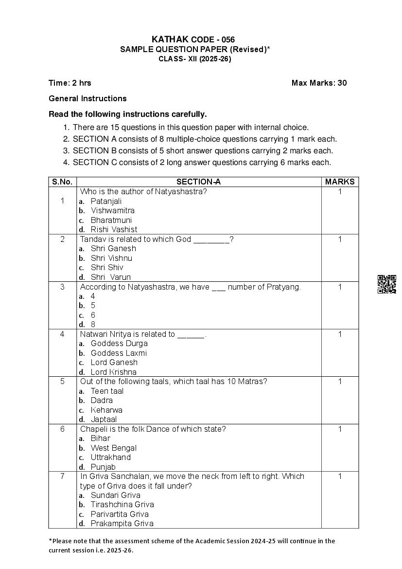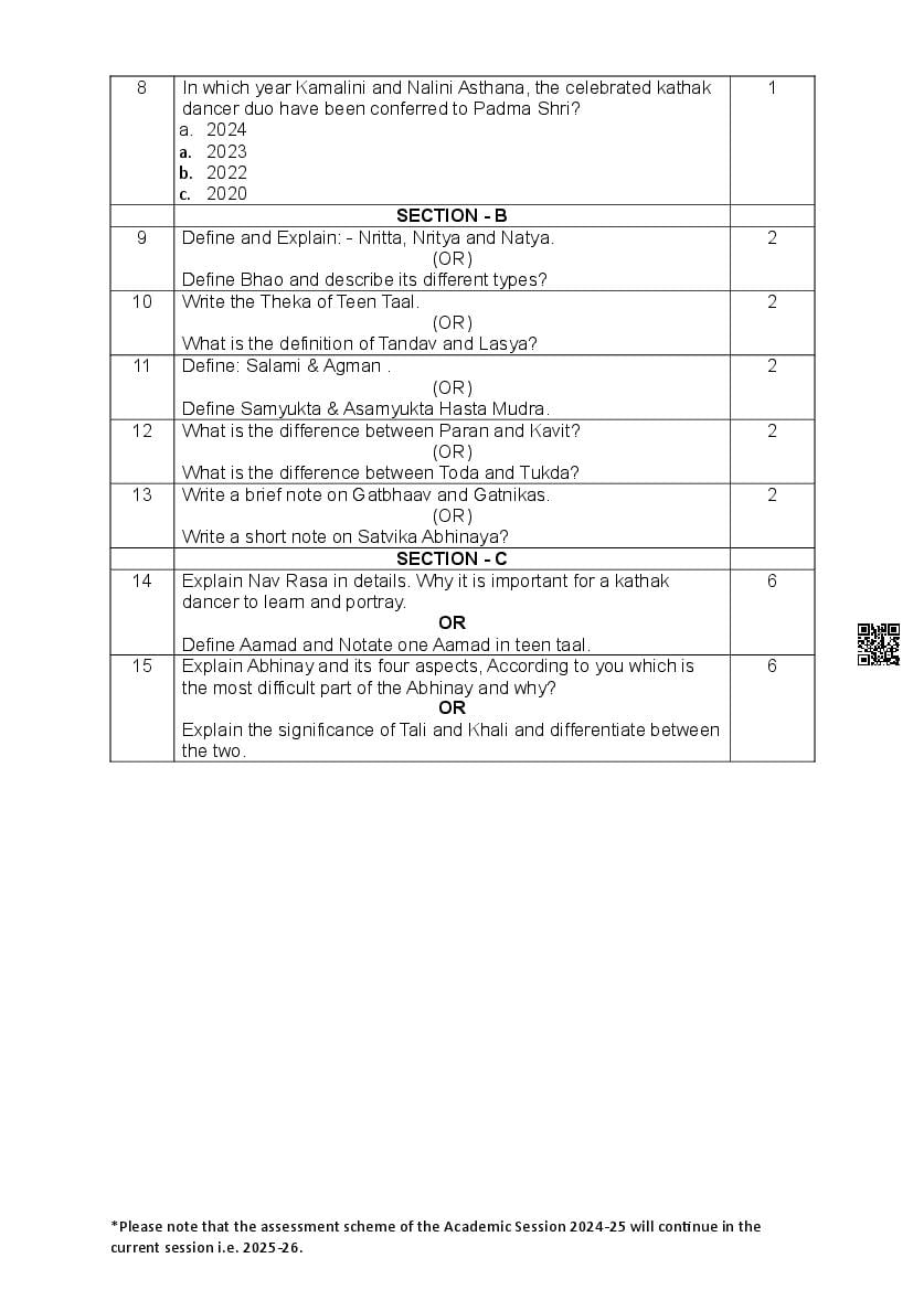 The complete CBSE class 12 Kathak sample paper 2026 is as follows. However the download link for cbse sample paper Kathak class 12 marking scheme is given above.